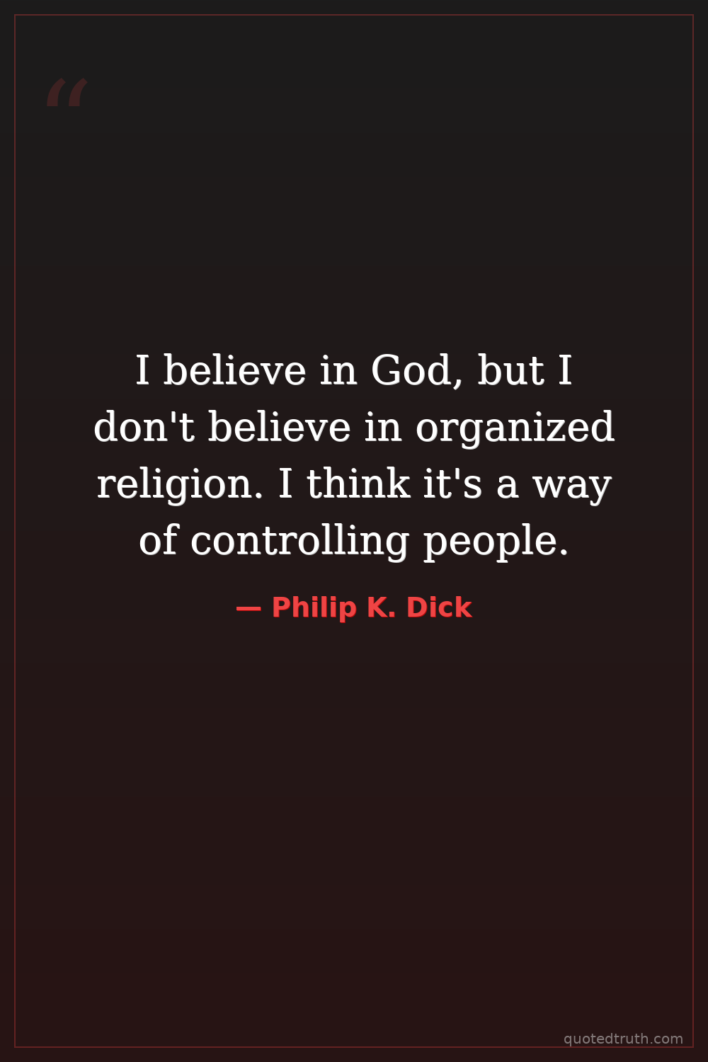 I believe in God, but I don't believe in organized religion. I think it's a way of controlling people.