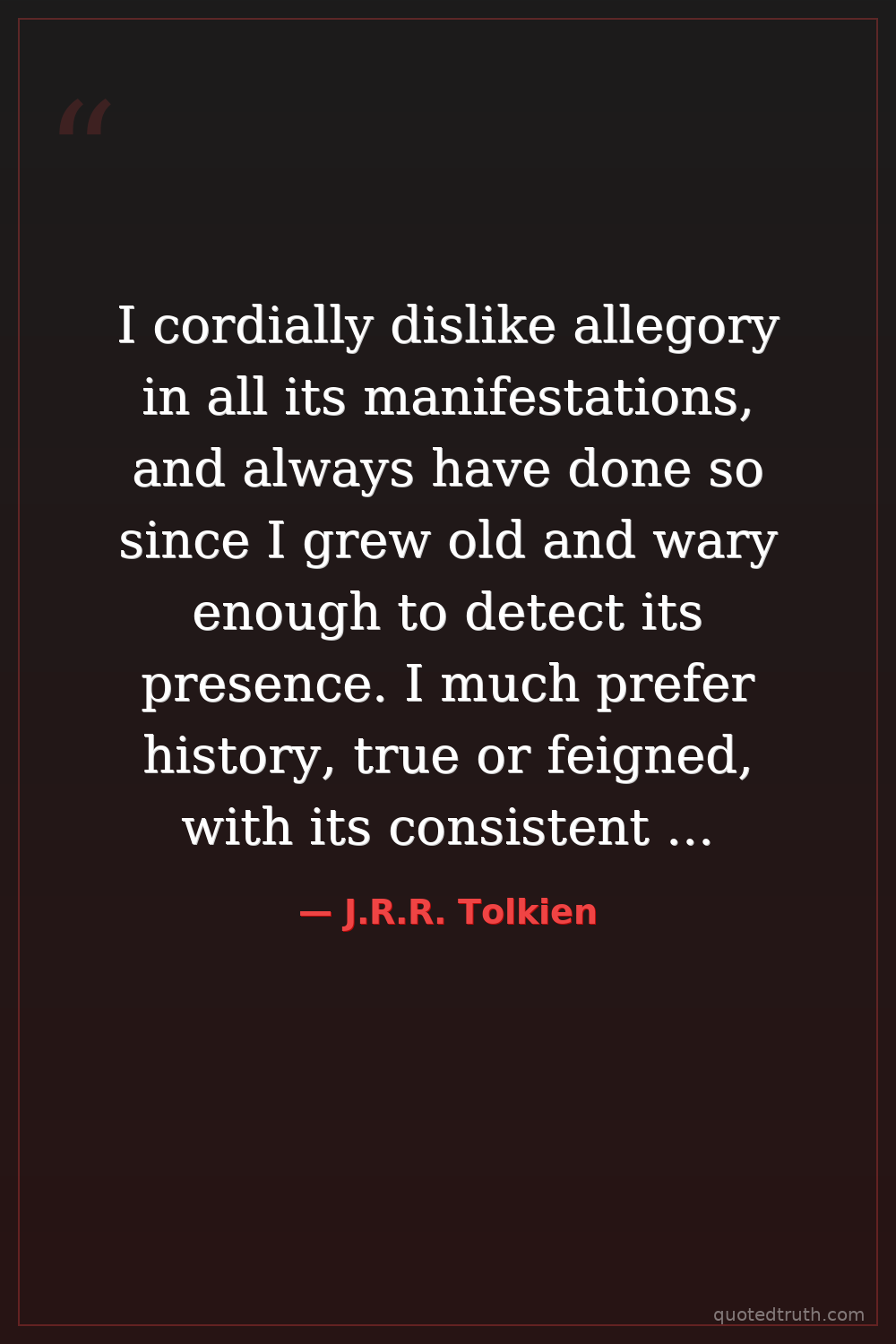 I cordially dislike allegory in all its manifestations, and always have done so since I grew old and wary enough to detect its presence. I much prefer history, true or feigned, with its consistent internal reference, and the green secondary world of Faërie with its own inner consistency of reality.