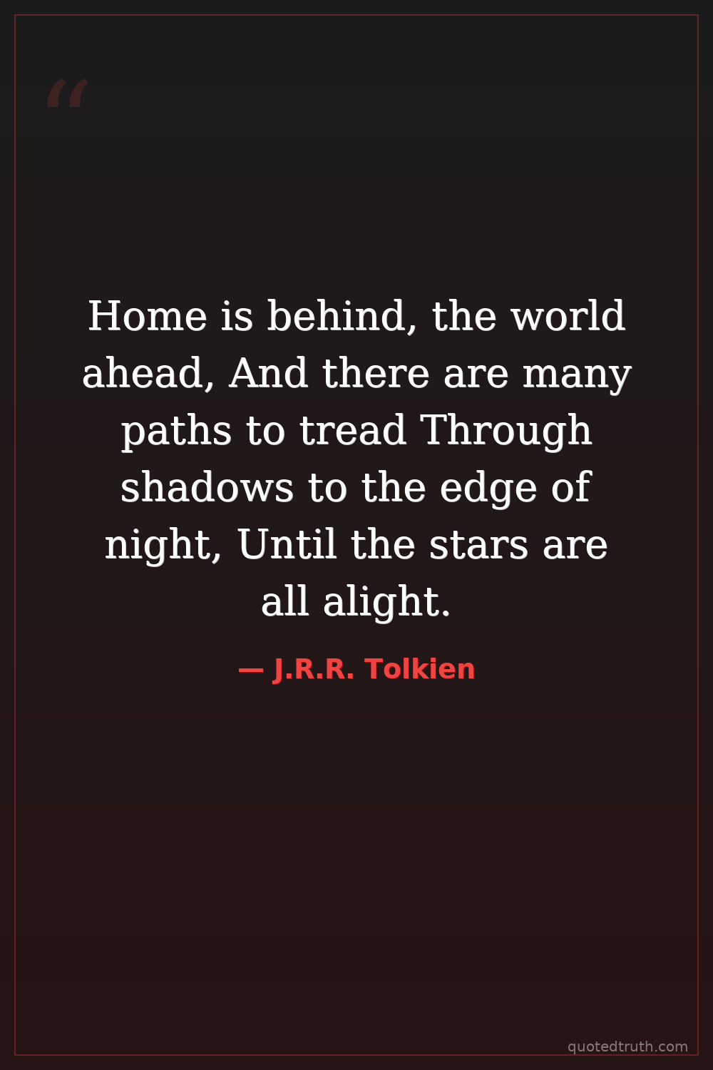 Home is behind, the world ahead, And there are many paths to tread Through shadows to the edge of night, Until the stars are all alight.