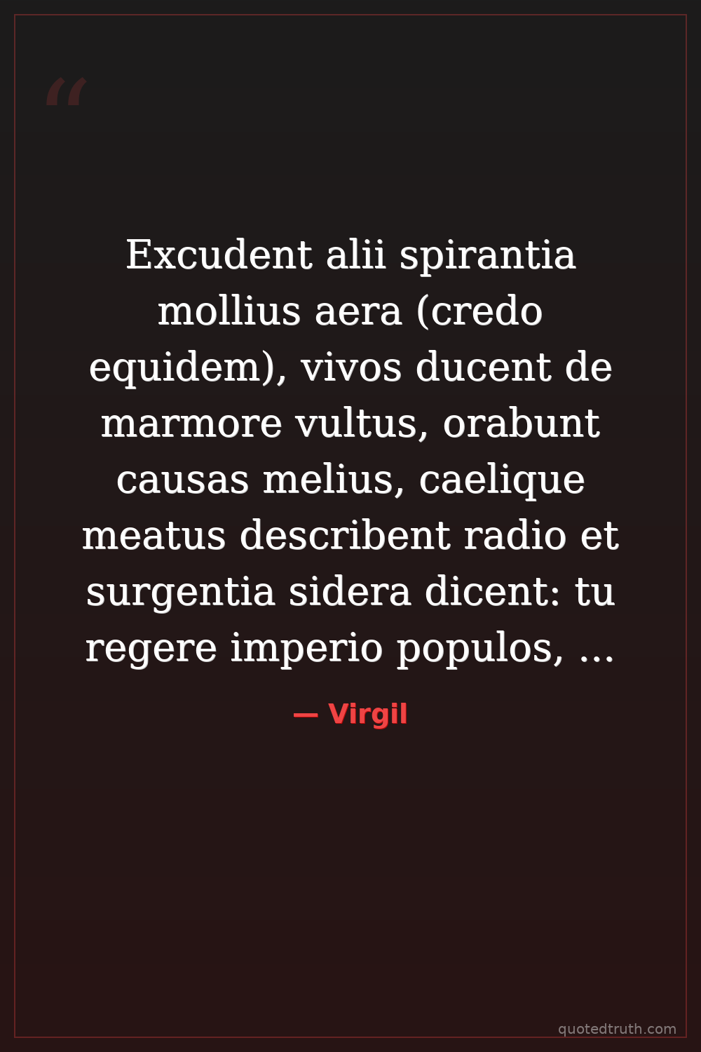 Excudent alii spirantia mollius aera (credo equidem), vivos ducent de marmore vultus, orabunt causas melius, caelique meatus describent radio et surgentia sidera dicent: tu regere imperio populos, Romane, memento (hae tibi erunt artes), pacique imponere morem, parcere subiectis et debellare superbos.
