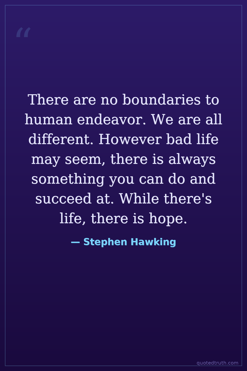 There are no boundaries to human endeavor. We are all different. However bad life may seem, there is always something you can do and succeed at. While there's life, there is hope.