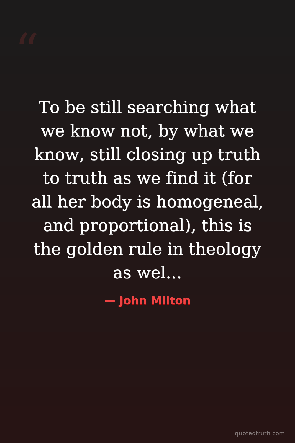 To be still searching what we know not, by what we know, still closing up truth to truth as we find it (for all her body is homogeneal, and proportional), this is the golden rule in theology as well as in arithmetic, and makes up the best harmony in a church; not the forced and outward union of cold, and neutral, and inwardly divided minds.