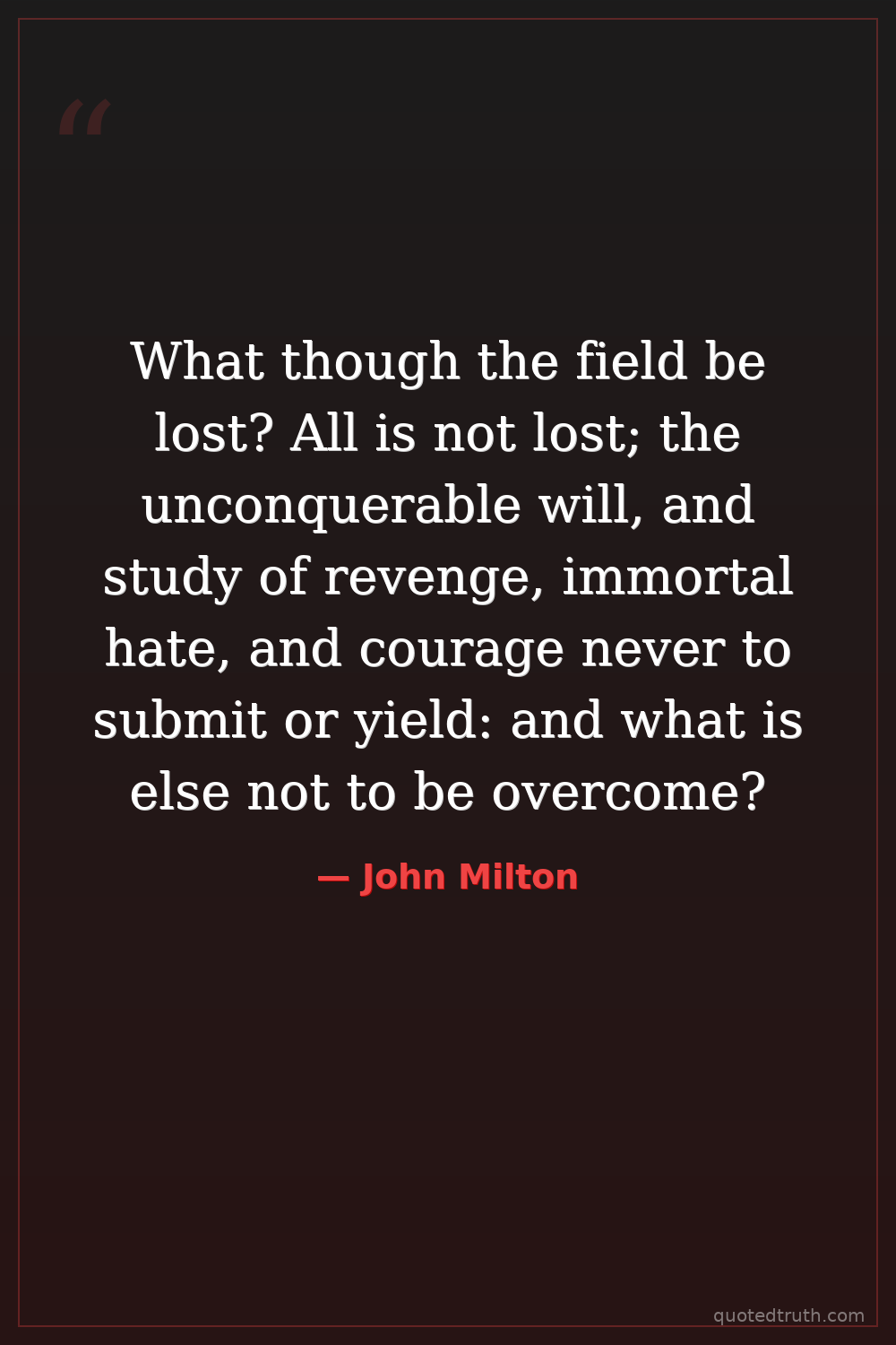 What though the field be lost? All is not lost; the unconquerable will, and study of revenge, immortal hate, and courage never to submit or yield: and what is else not to be overcome?