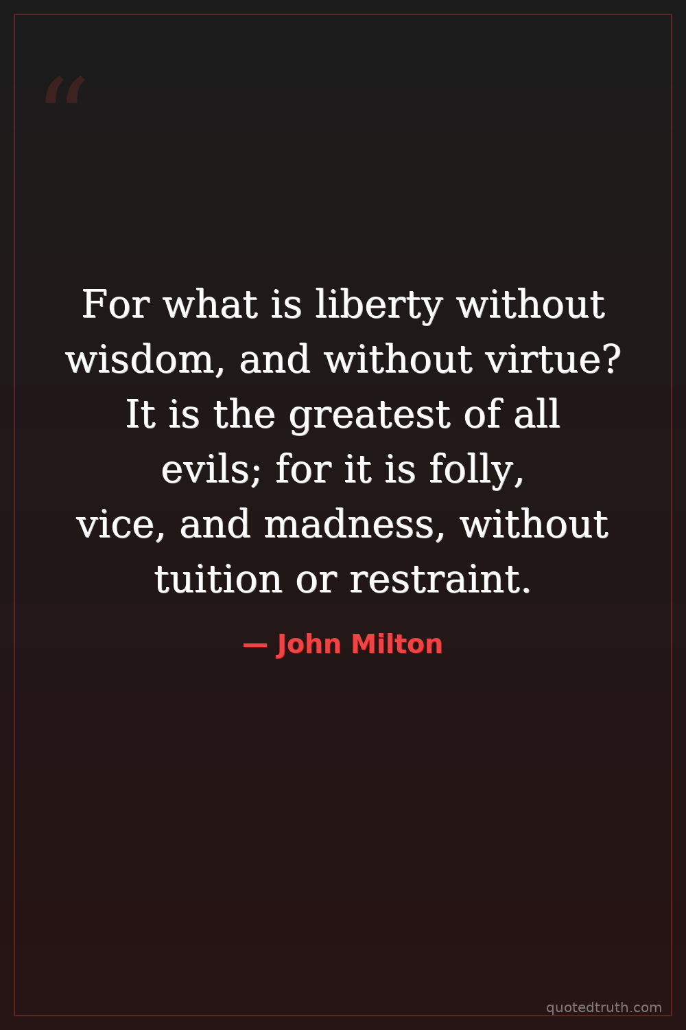 For what is liberty without wisdom, and without virtue? It is the greatest of all evils; for it is folly, vice, and madness, without tuition or restraint.