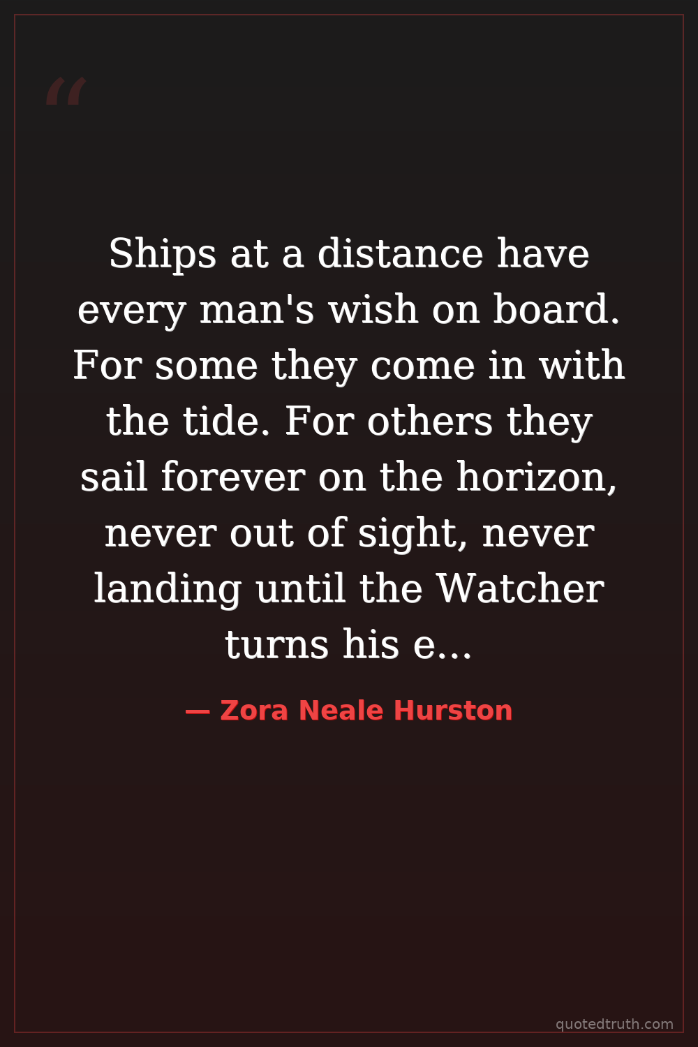 Ships at a distance have every man's wish on board. For some they come in with the tide. For others they sail forever on the horizon, never out of sight, never landing until the Watcher turns his eyes away in resignation, his dreams mocked to death by Time. That is the life of men. Now, women forget all those things they don't want to remember, and remember everything they don't want to forget. The dream is the truth. Then they act and do things accordingly.