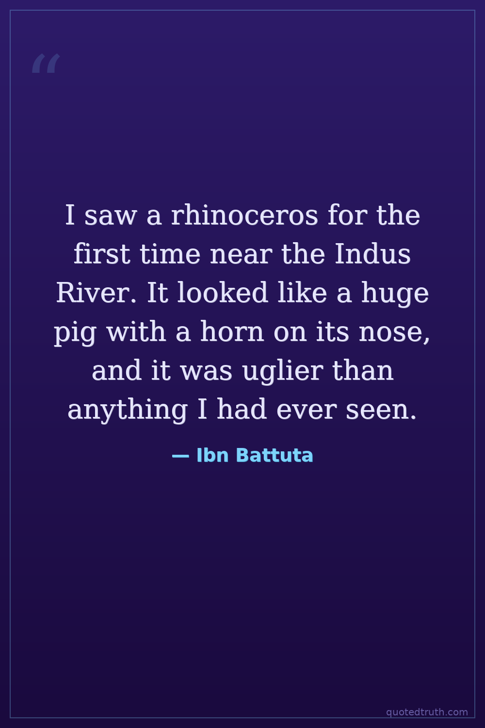 I saw a rhinoceros for the first time near the Indus River. It looked like a huge pig with a horn on its nose, and it was uglier than anything I had ever seen.