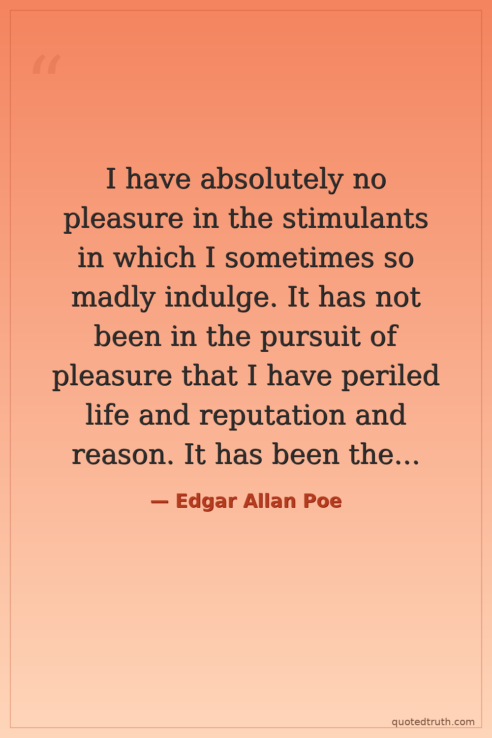I have absolutely no pleasure in the stimulants in which I sometimes so madly indulge. It has not been in the pursuit of pleasure that I have periled life and reputation and reason. It has been the desperate attempt to escape from torturing memories, from a sense of insupportable loneliness and a dread of some strange impending doom.