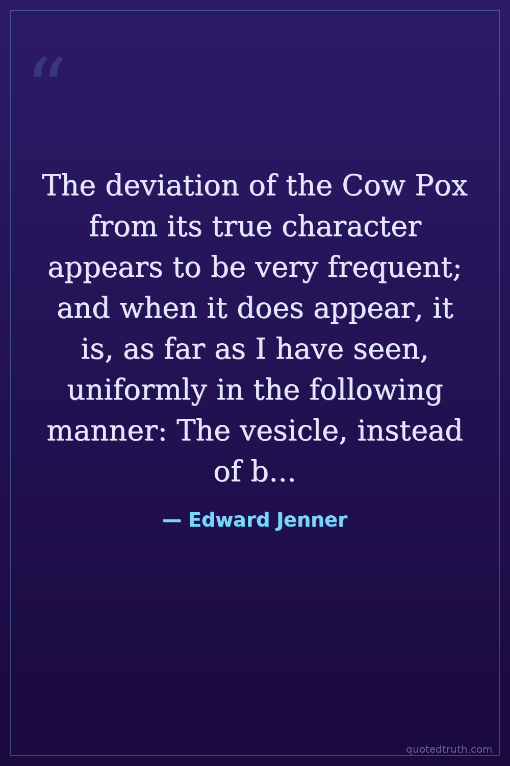 The deviation of the Cow Pox from its true character appears to be very frequent; and when it does appear, it is, as far as I have seen, uniformly in the following manner: The vesicle, instead of being pellucid, and having a circular form, with its edges a little elevated, becomes of an opaque white, and its edges are more depressed than its centre, so that it resembles a small pearl. Sometimes it is surrounded by an erysipelatous inflammation.