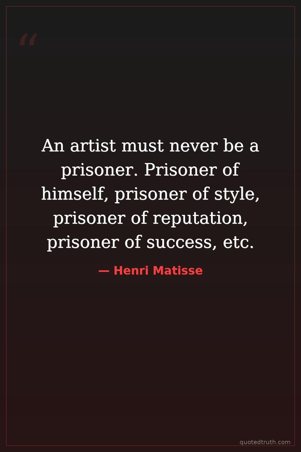 An artist must never be a prisoner. Prisoner of himself, prisoner of style, prisoner of reputation, prisoner of success, etc.