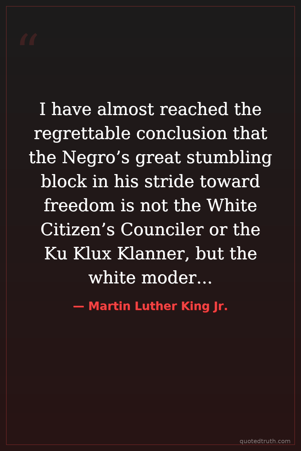 I have almost reached the regrettable conclusion that the Negro’s great stumbling block in his stride toward freedom is not the White Citizen’s Counciler or the Ku Klux Klanner, but the white moderate, who is more devoted to ‘order’ than to justice.