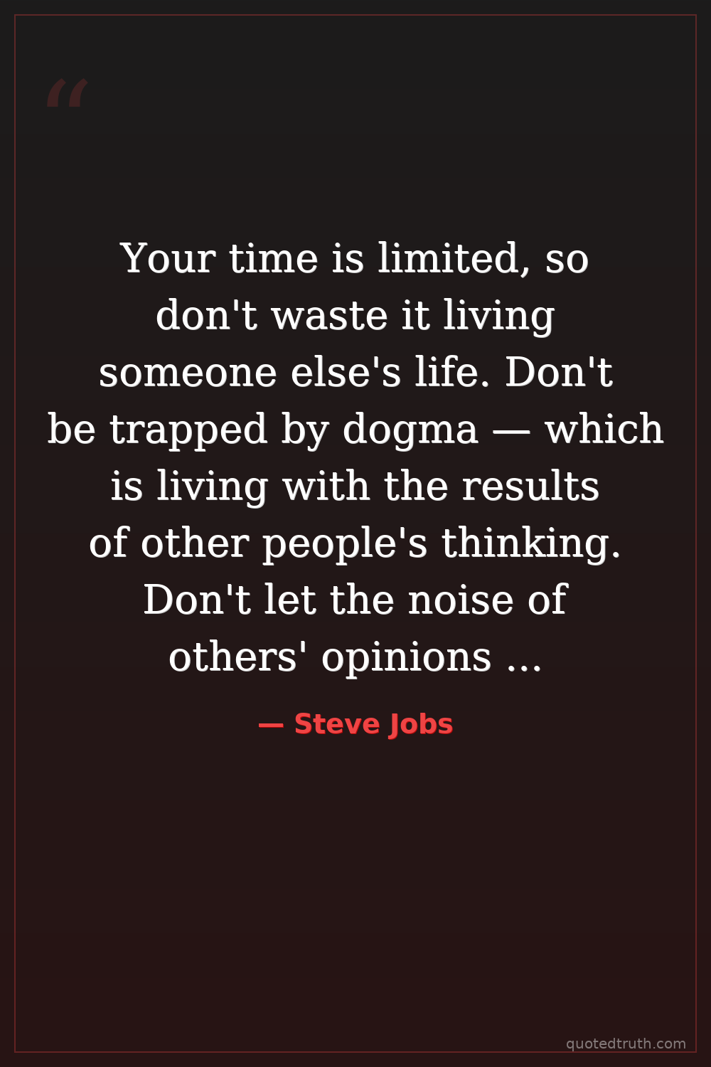 Your time is limited, so don't waste it living someone else's life. Don't be trapped by dogma — which is living with the results of other people's thinking. Don't let the noise of others' opinions drown out your own inner voice. And most important, have the courage to follow your heart and intuition. They somehow already know what you truly want to become. Everything else is secondary.