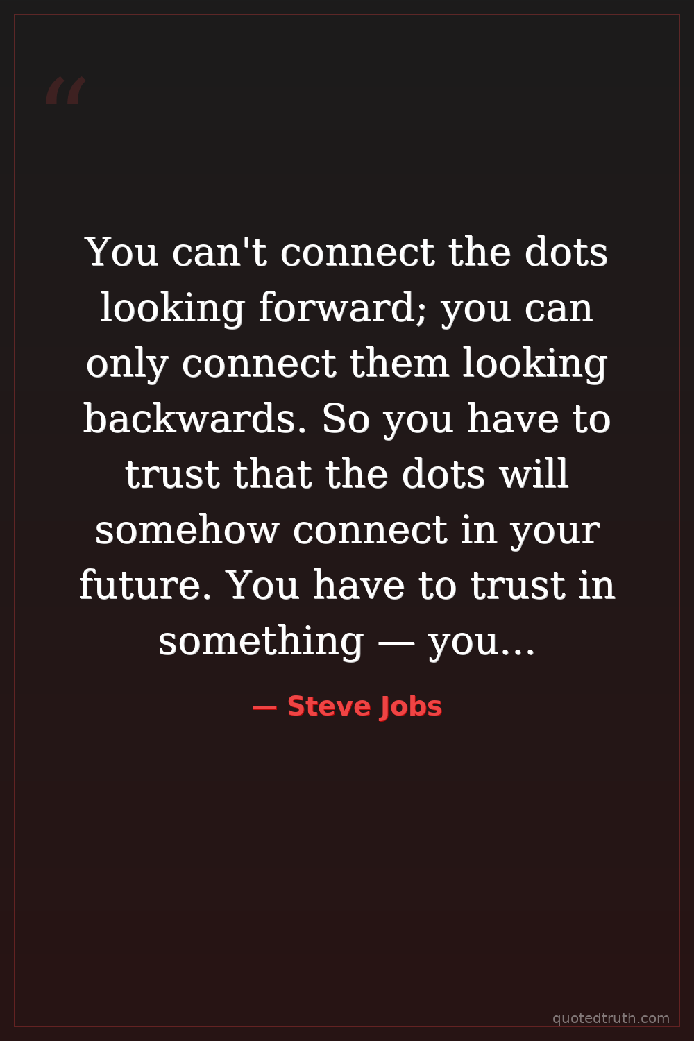 You can't connect the dots looking forward; you can only connect them looking backwards. So you have to trust that the dots will somehow connect in your future. You have to trust in something — your gut, destiny, life, karma, whatever. This approach has never let me down, and it has made all the difference in my life.