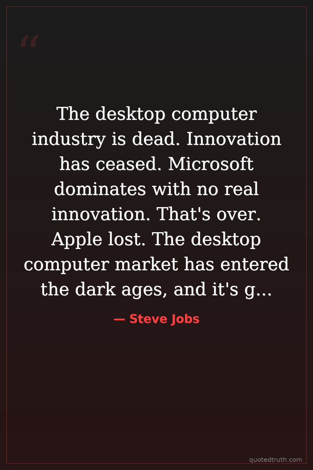 The desktop computer industry is dead. Innovation has ceased. Microsoft dominates with no real innovation. That's over. Apple lost. The desktop computer market has entered the dark ages, and it's going to be in the dark ages for the next 10 years, or certainly for the rest of this decade.