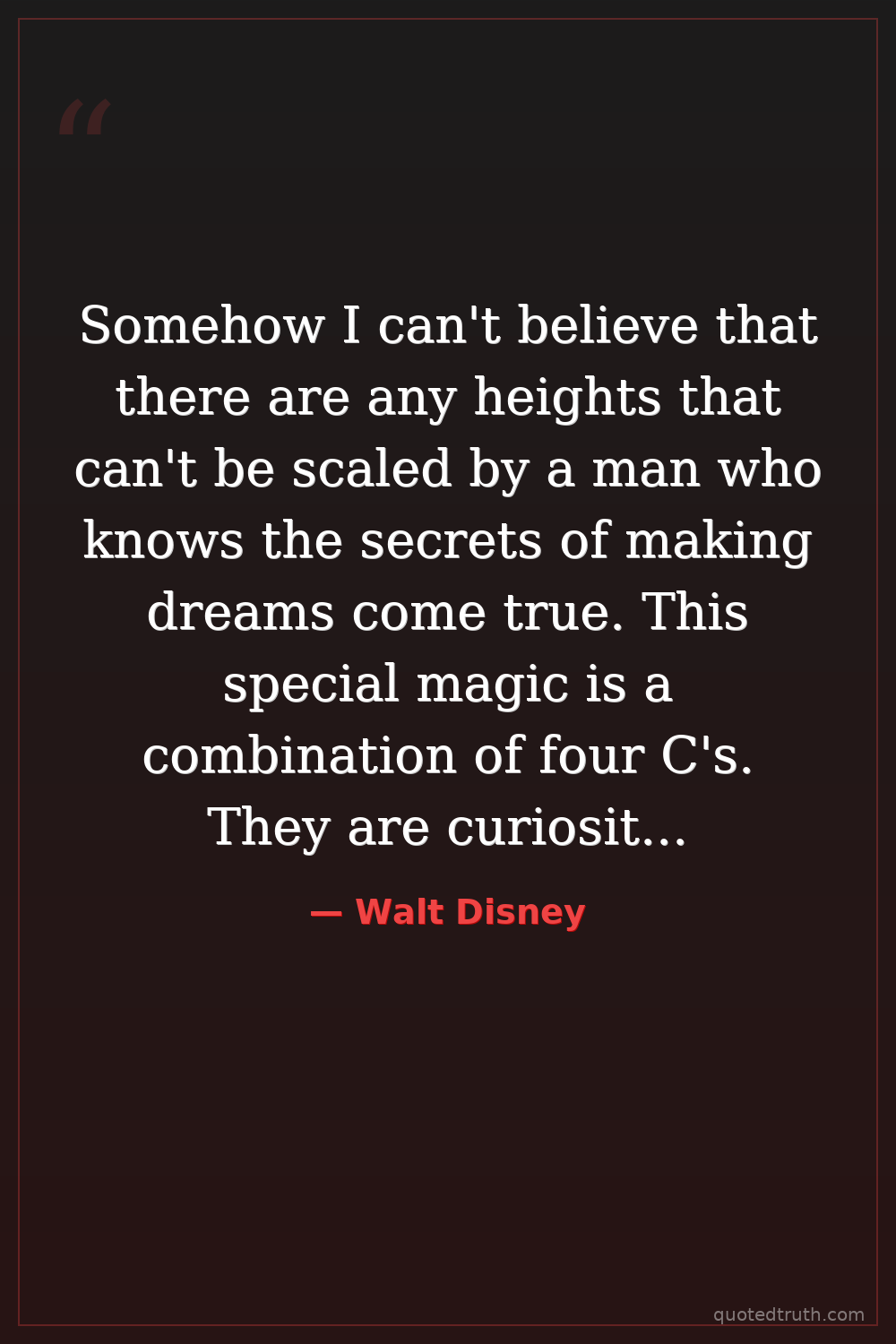 Somehow I can't believe that there are any heights that can't be scaled by a man who knows the secrets of making dreams come true. This special magic is a combination of four C's. They are curiosity, confidence, courage, and constancy. — Walt Disney Modern Disney entertainment empire