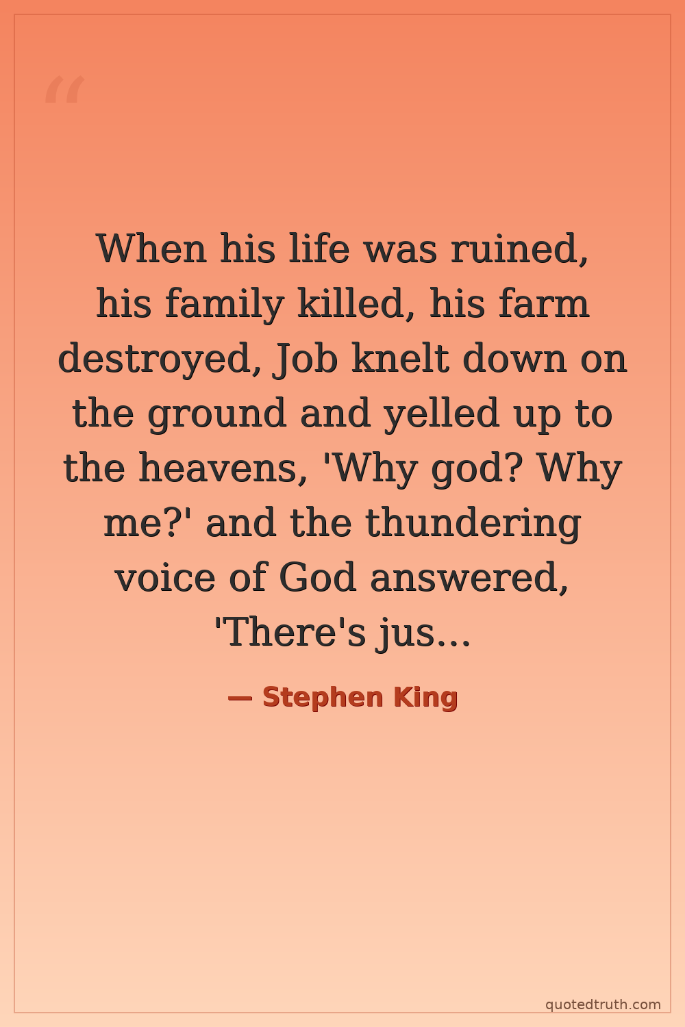 When his life was ruined, his family killed, his farm destroyed, Job knelt down on the ground and yelled up to the heavens, 'Why god? Why me?' and the thundering voice of God answered, 'There's just something about you that pisses me off.' — Stephen King Contemporary Horror fiction