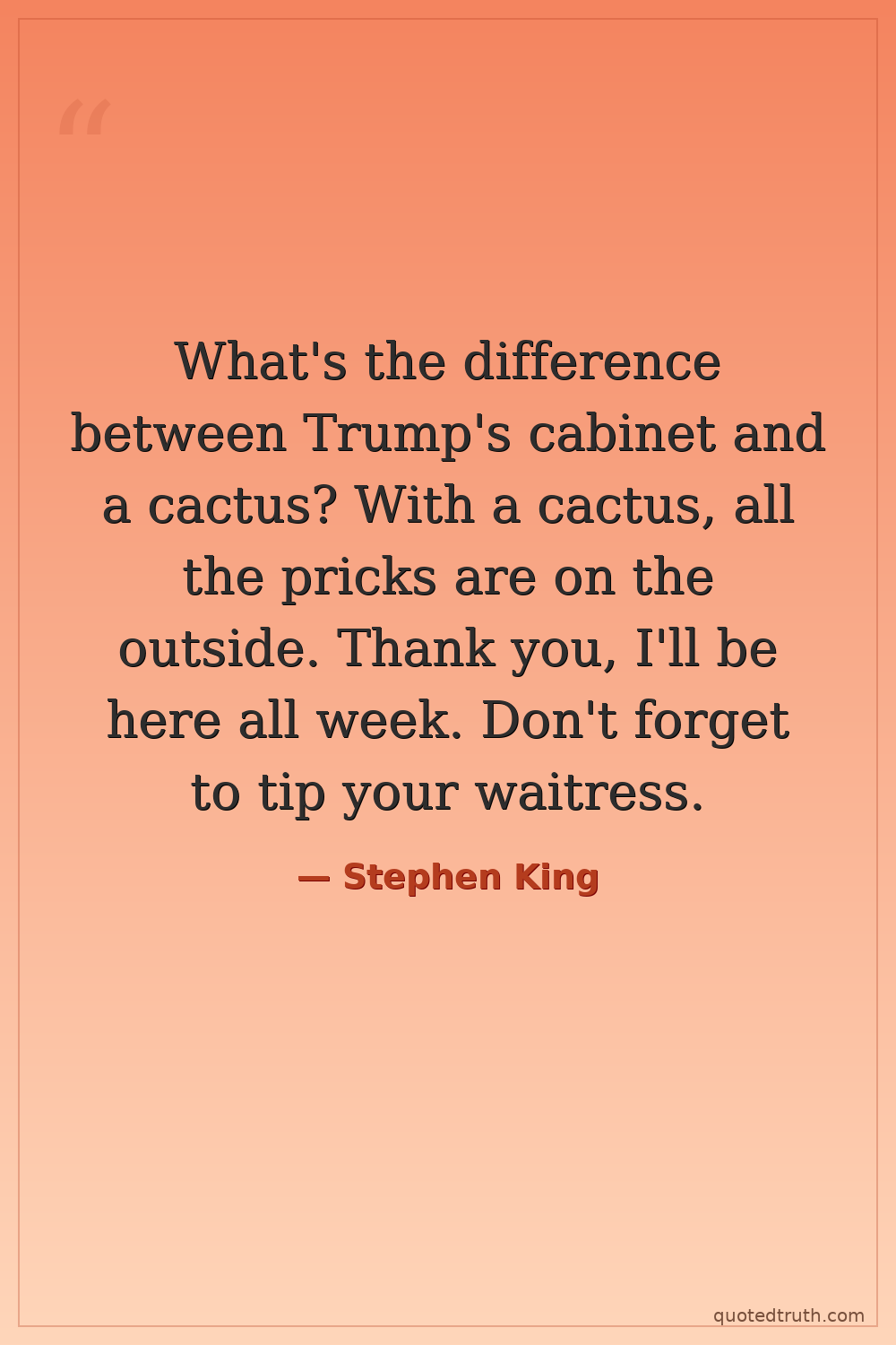 What's the difference between Trump's cabinet and a cactus? With a cactus, all the pricks are on the outside. Thank you, I'll be here all week. Don't forget to tip your waitress.