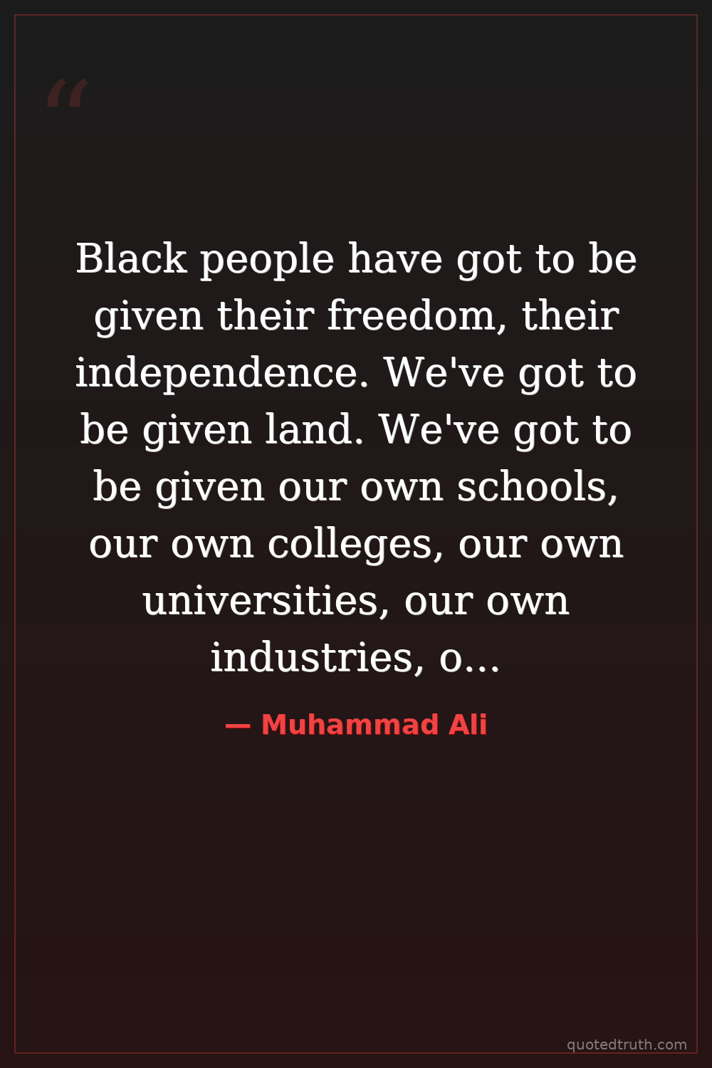 Black people have got to be given their freedom, their independence. We've got to be given land. We've got to be given our own schools, our own colleges, our own universities, our own industries, our own factories, our own everything. We've got to be given our own country.