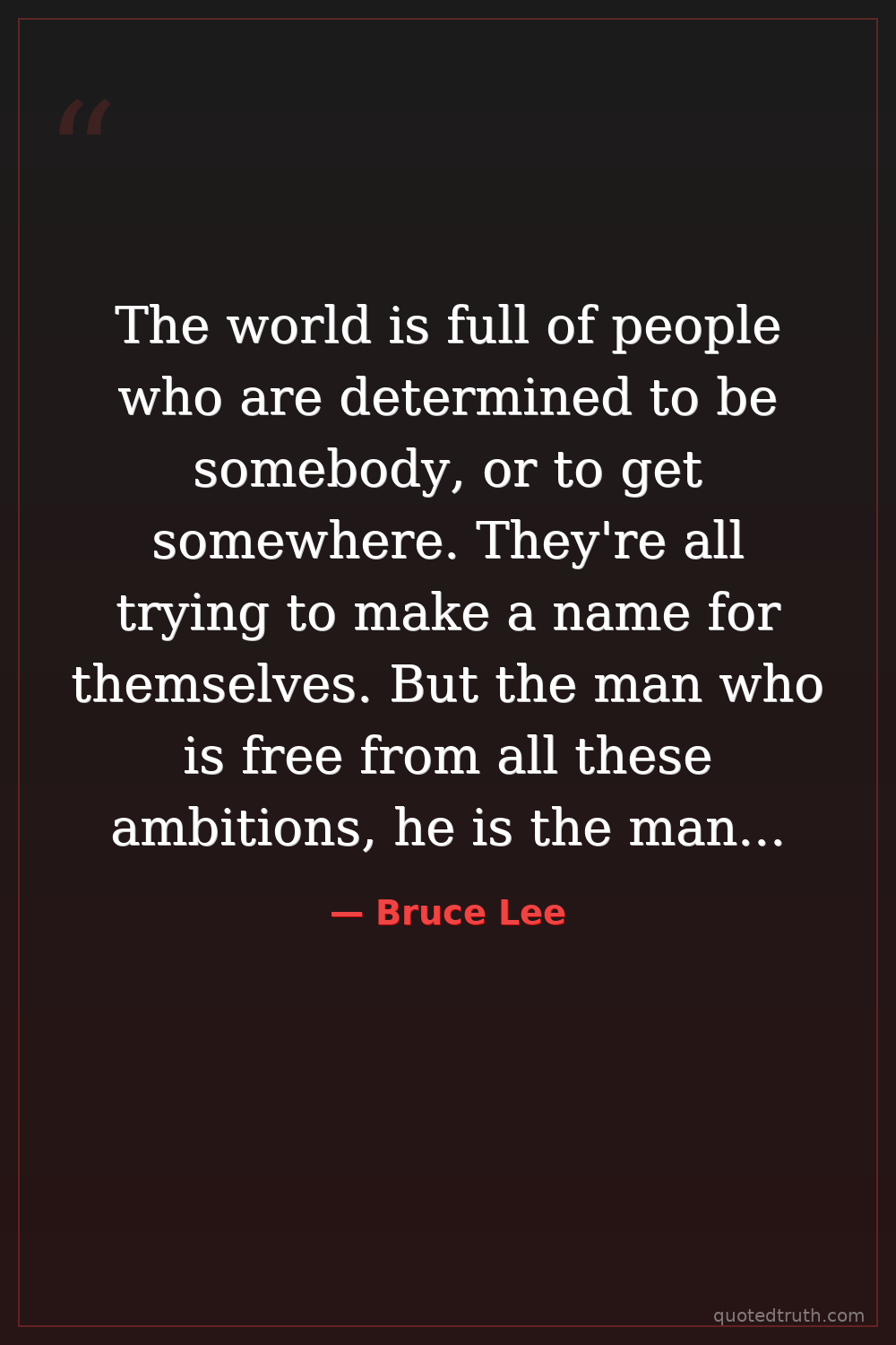 The world is full of people who are determined to be somebody, or to get somewhere. They're all trying to make a name for themselves. But the man who is free from all these ambitions, he is the man who can be truly free. — Bruce Lee Modern Martial artist, actor, philosopher