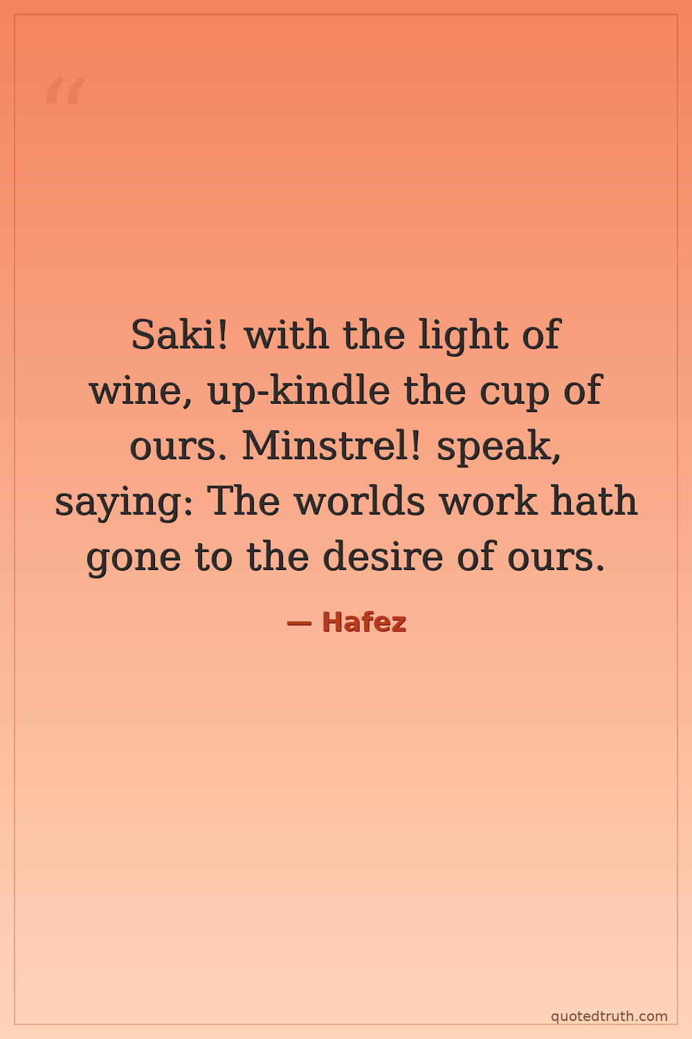 Saki! with the light of wine, up-kindle the cup of ours. Minstrel! speak, saying: The worlds work hath gone to the desire of ours.
