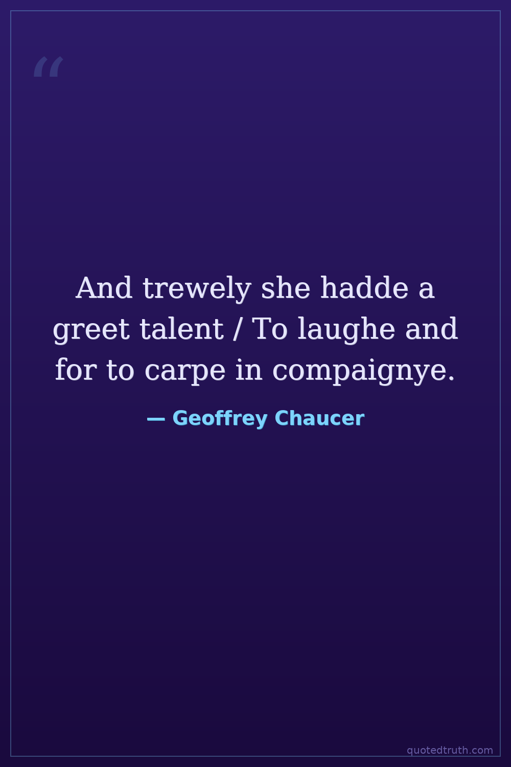 General Prologue to The Canterbury Tales, describing the Wife of Bath's boisterous and talkative nature. 'Greet talent to laughe and for to carpe' is an unusual way to describe her extroversion.