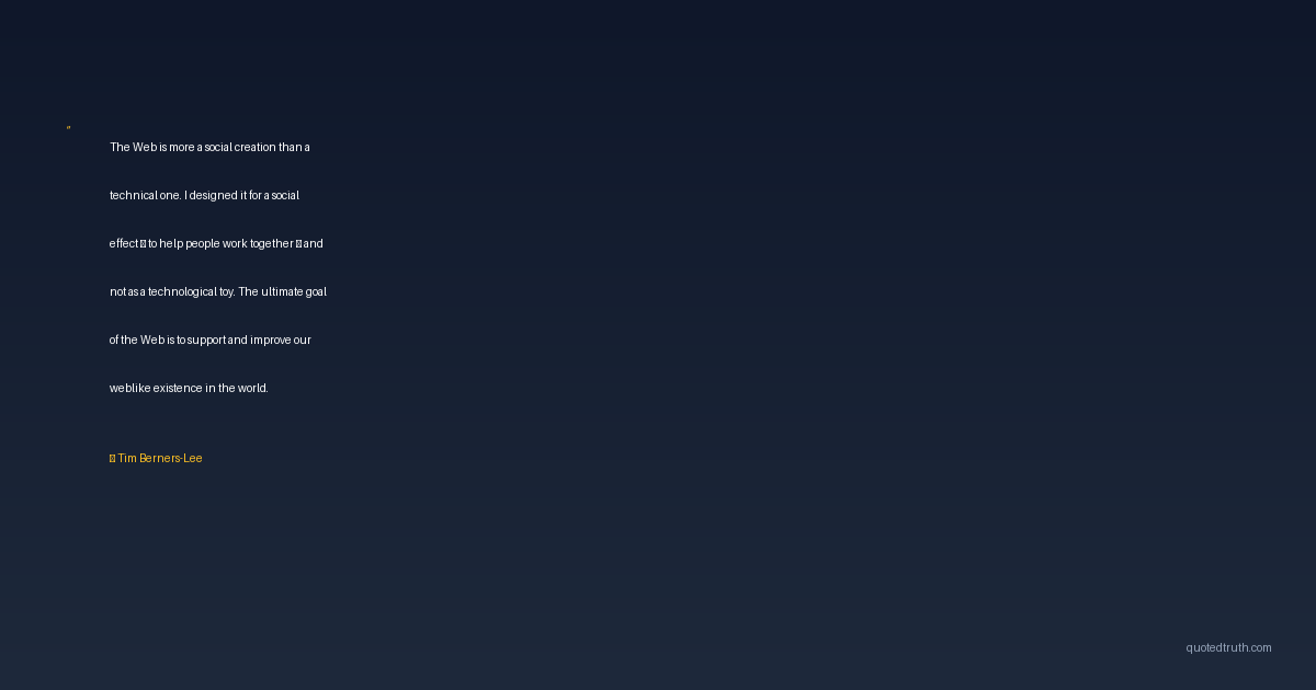 The Web is more a social creation than a technical one. I designed it for a social effect — to help people work together — and not as a technological toy. The ultimate goal of the Web is to support and improve our weblike existence in the world.