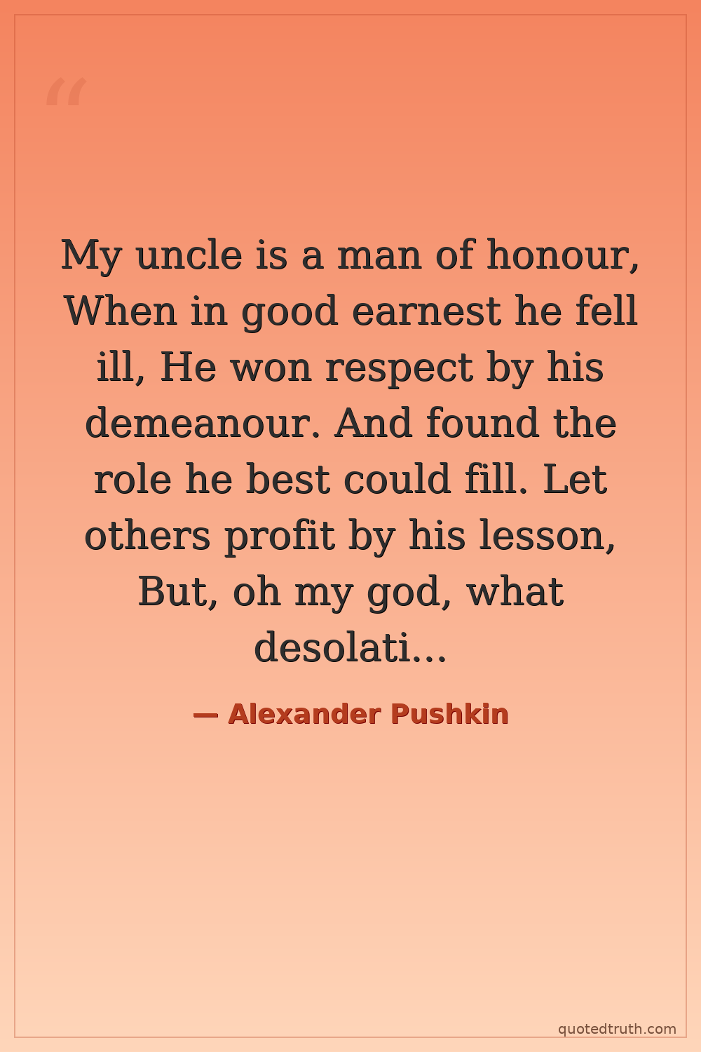 My uncle is a man of honour, When in good earnest he fell ill, He won respect by his demeanour. And found the role he best could fill. Let others profit by his lesson, But, oh my god, what desolation. To tend a sick man day and night. And not to venture from his sight! What shameful cunning to be cheerful. With someone who is halfway dead, To prop up pillows by his head, To bring him medicine, looking tearful, To sigh – while inwardly you think: When will the devil let him sink?
