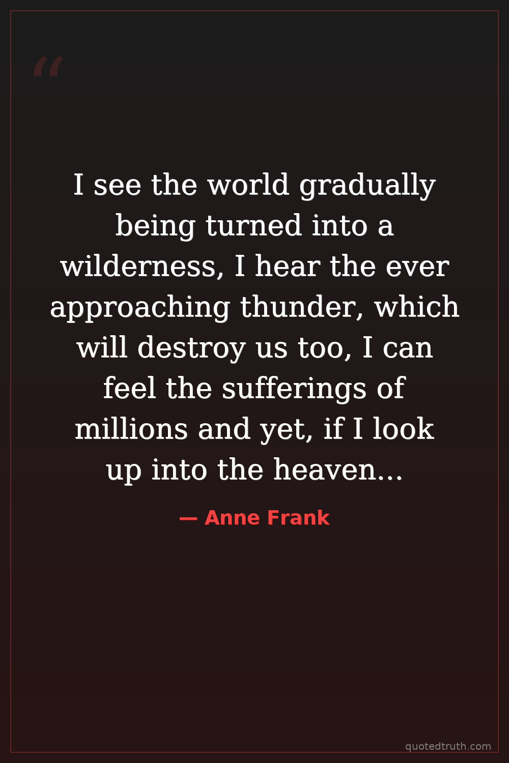 I see the world gradually being turned into a wilderness, I hear the ever approaching thunder, which will destroy us too, I can feel the sufferings of millions and yet, if I look up into the heavens, I think that it will all come right, that this cruelty too will end, and that peace and tranquility will return again.