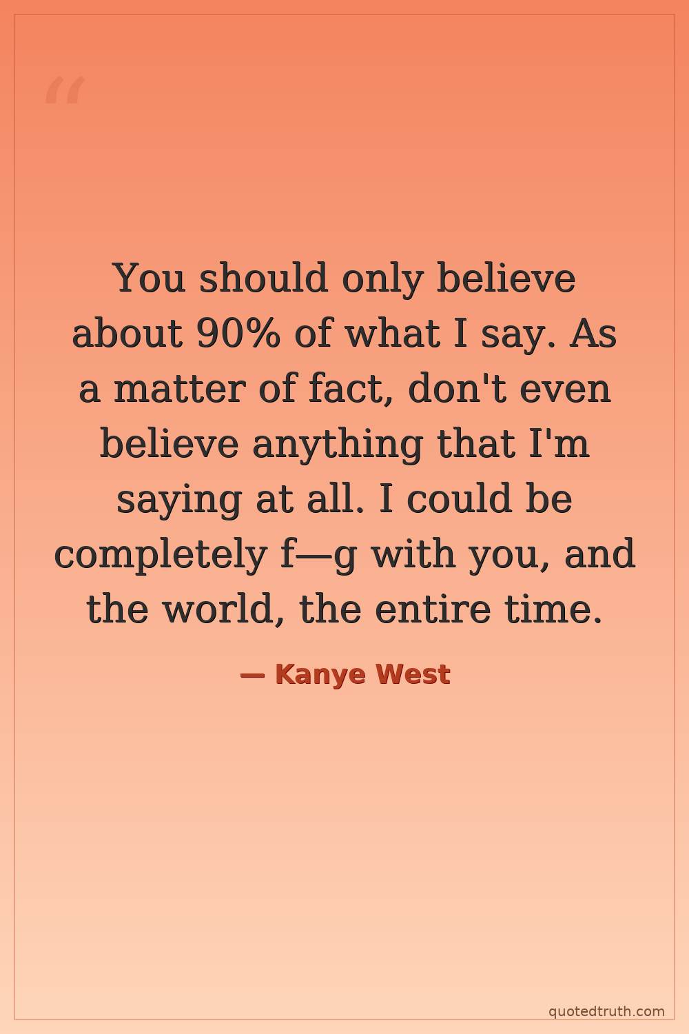 You should only believe about 90% of what I say. As a matter of fact, don't even believe anything that I'm saying at all. I could be completely f—g with you, and the world, the entire time.