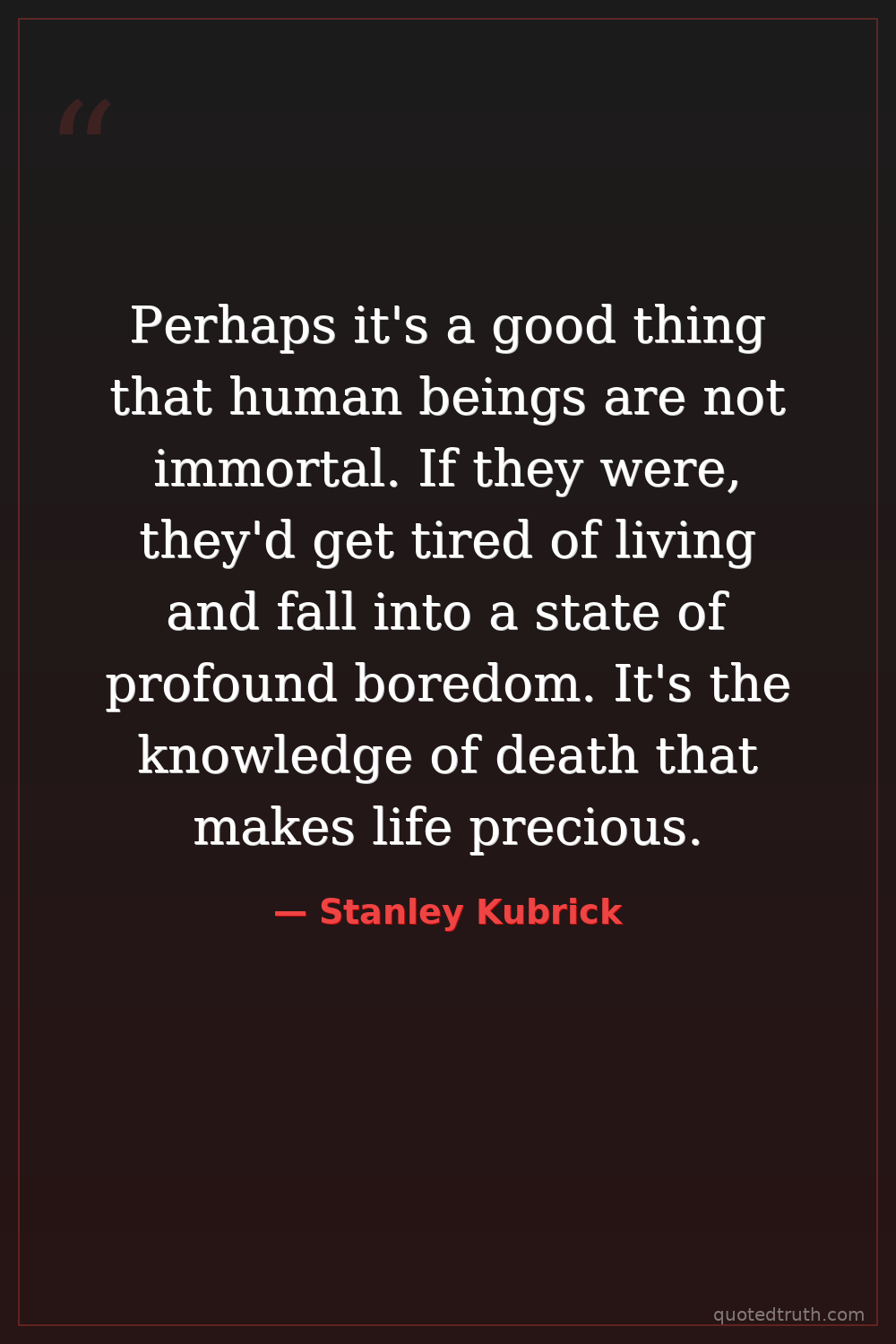 Perhaps it's a good thing that human beings are not immortal. If they were, they'd get tired of living and fall into a state of profound boredom. It's the knowledge of death that makes life precious.
