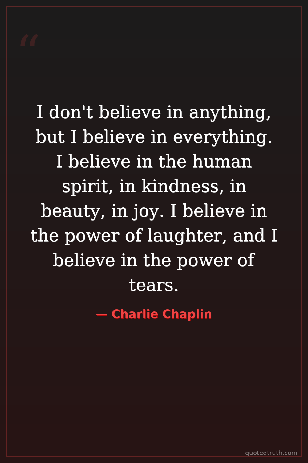 I don't believe in anything, but I believe in everything. I believe in the human spirit, in kindness, in beauty, in joy. I believe in the power of laughter, and I believe in the power of tears.