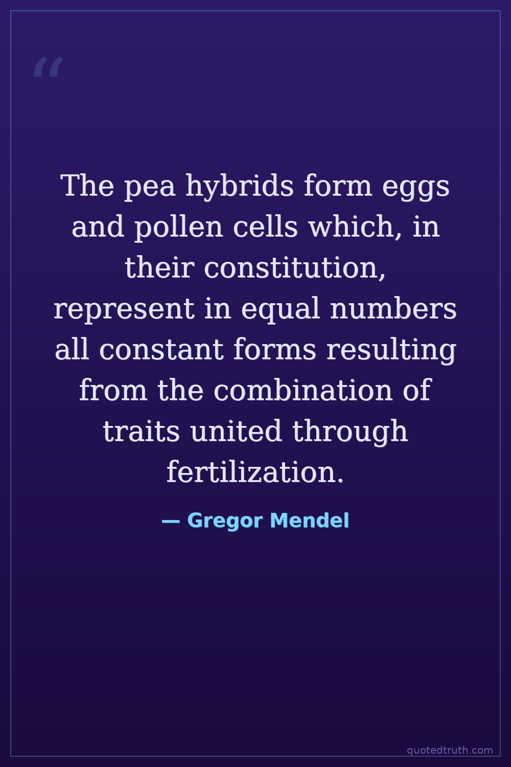 The pea hybrids form eggs and pollen cells which, in their constitution, represent in equal numbers all constant forms resulting from the combination of traits united through fertilization.