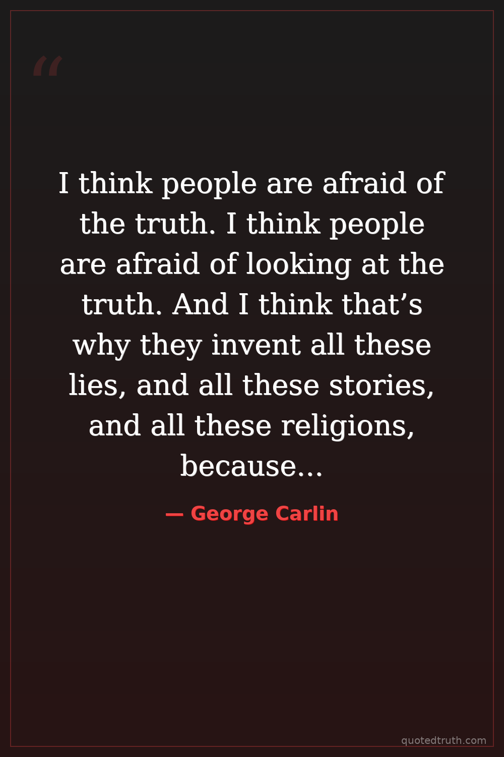 I think people are afraid of the truth. I think people are afraid of looking at the truth. And I think that’s why they invent all these lies, and all these stories, and all these religions, because they don’t want to face the truth. — George Carlin Contemporary Comedian, social critic
