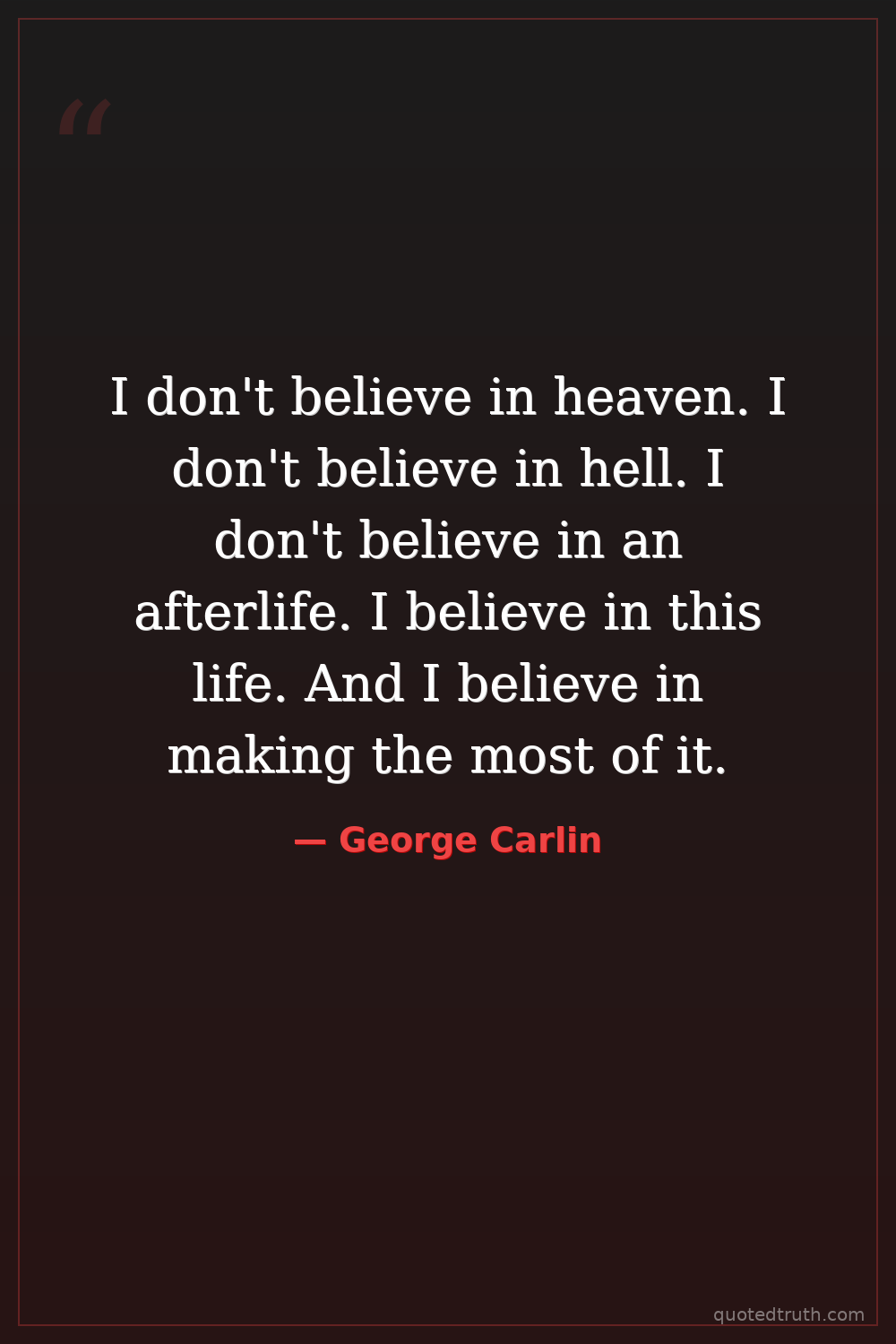 I don't believe in heaven. I don't believe in hell. I don't believe in an afterlife. I believe in this life. And I believe in making the most of it.