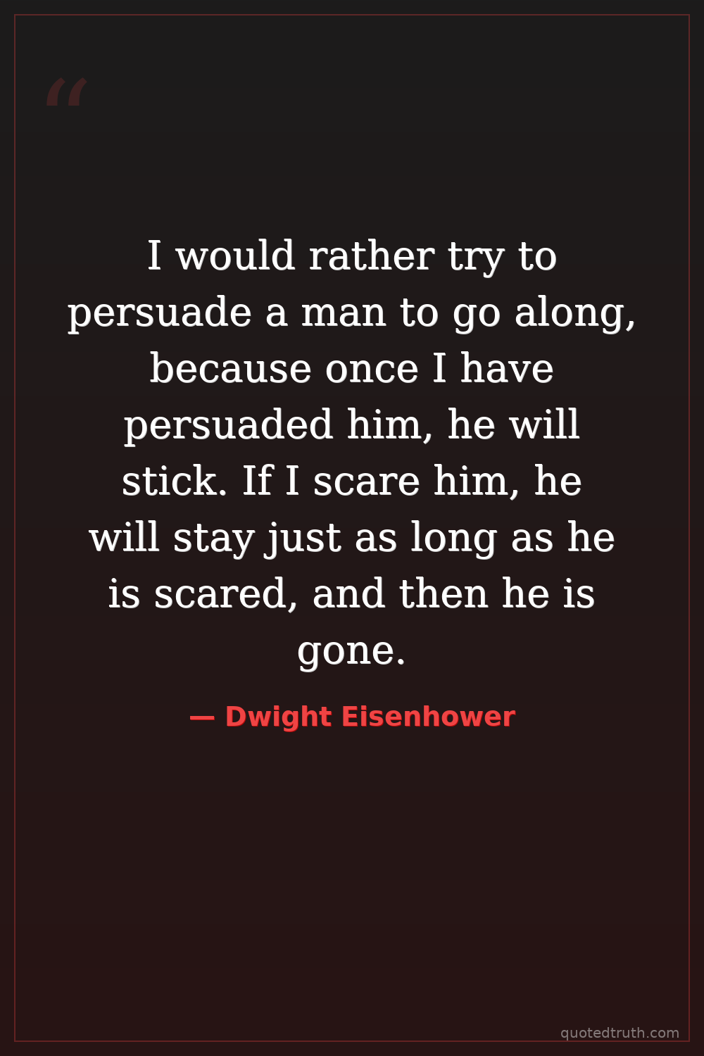 I would rather try to persuade a man to go along, because once I have persuaded him, he will stick. If I scare him, he will stay just as long as he is scared, and then he is gone.