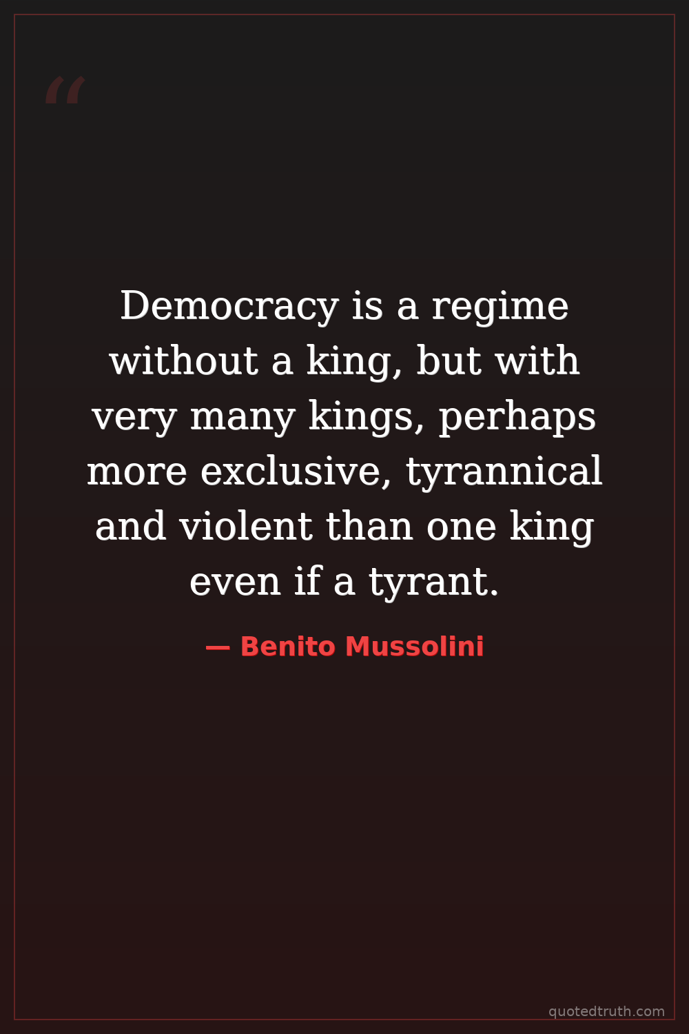 Democracy is a regime without a king, but with very many kings, perhaps more exclusive, tyrannical and violent than one king even if a tyrant.