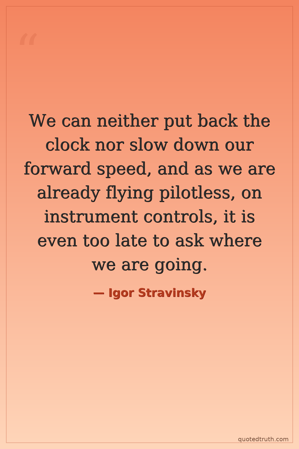 We can neither put back the clock nor slow down our forward speed, and as we are already flying pilotless, on instrument controls, it is even too late to ask where we are going.