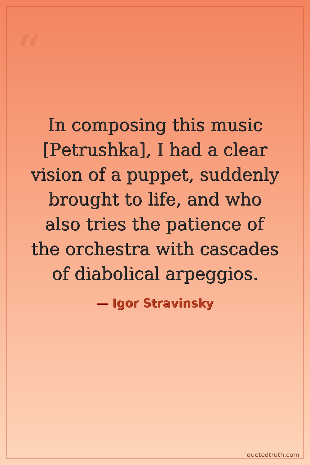 In composing this music [Petrushka], I had a clear vision of a puppet, suddenly brought to life, and who also tries the patience of the orchestra with cascades of diabolical arpeggios.