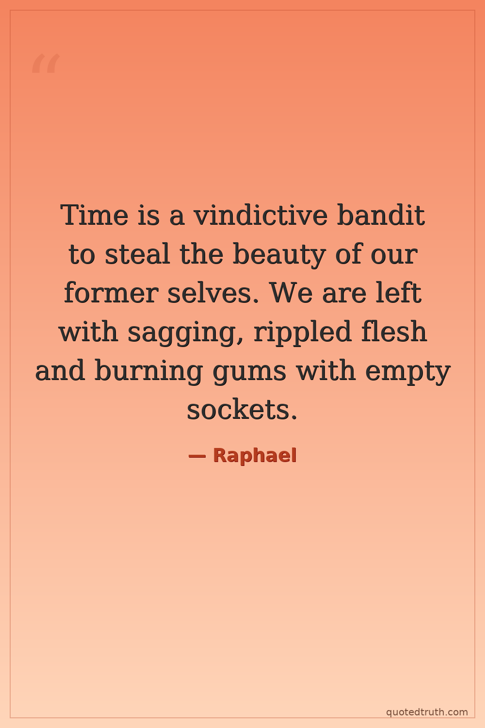 Time is a vindictive bandit to steal the beauty of our former selves. We are left with sagging, rippled flesh and burning gums with empty sockets.