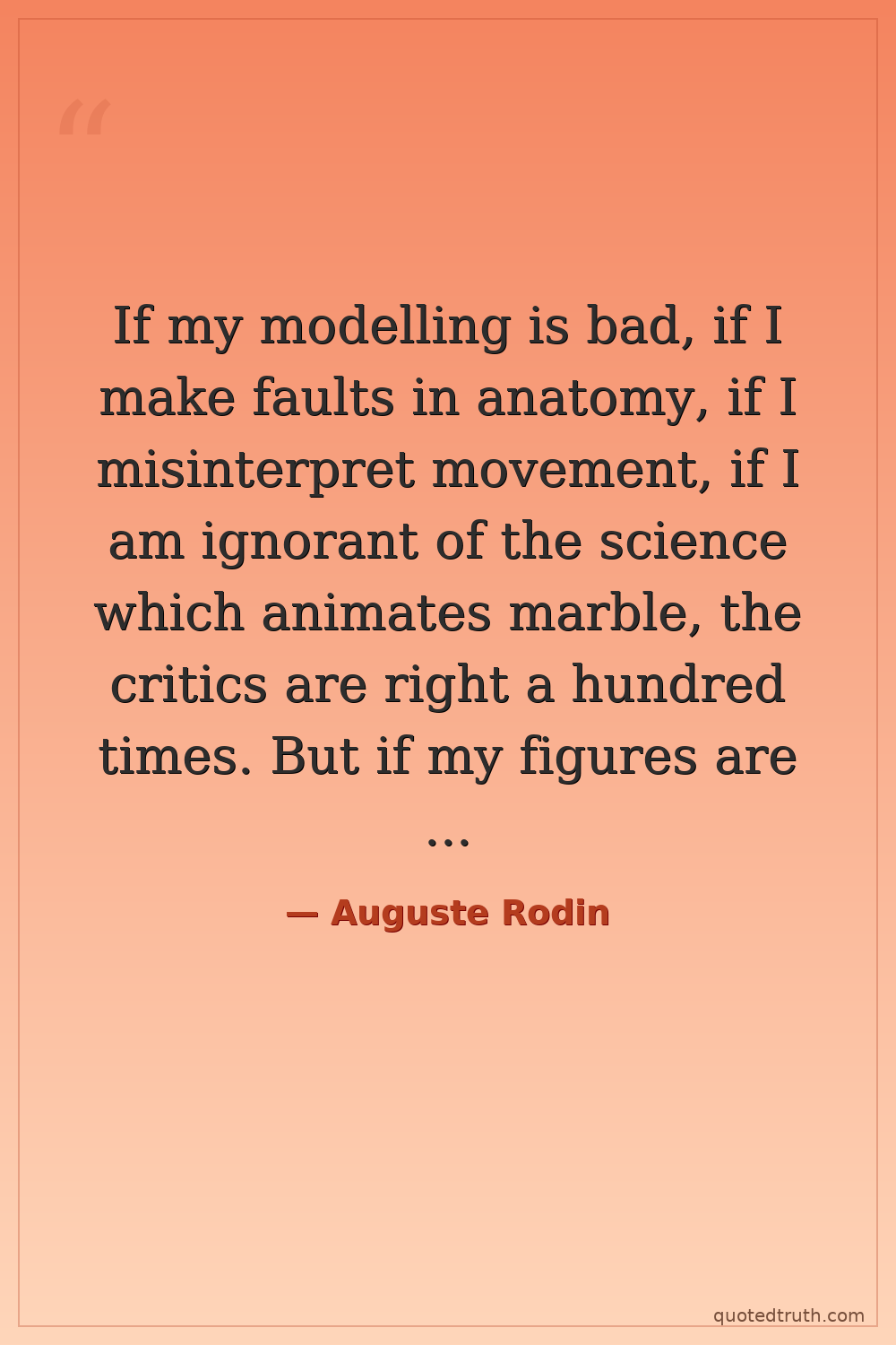 If my modelling is bad, if I make faults in anatomy, if I misinterpret movement, if I am ignorant of the science which animates marble, the critics are right a hundred times. But if my figures are correct and full of life, with what can they reproach me? What right have they to forbid me to add meaning to form? How can they complain if, over and above technique, I offer them ideas? — if I enrich those forms which please the eye with a definite significance? It is a strange mistake, this, to imagine that the true artist can be content to remain only a skilled workman and that he needs no intelligence.