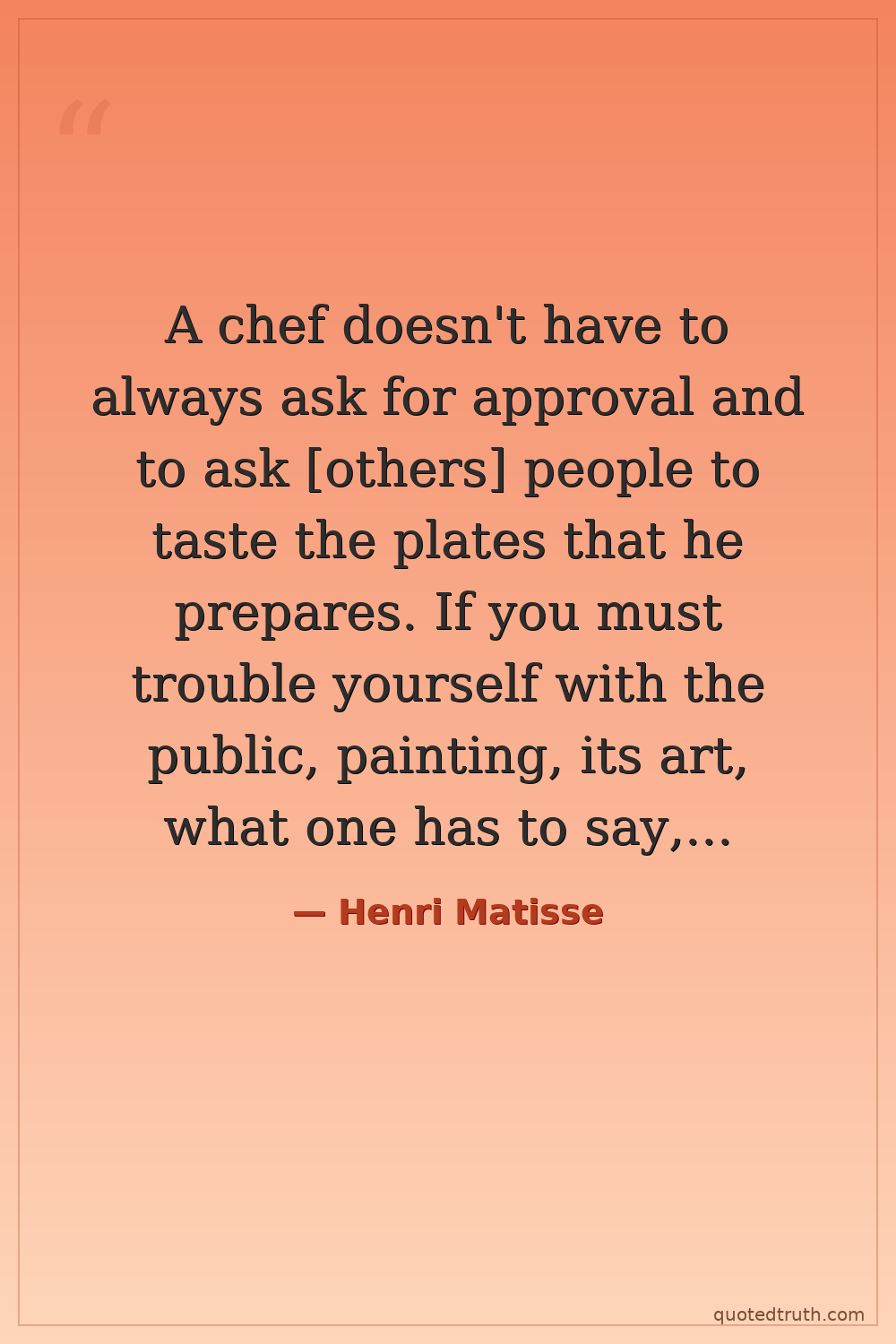 A chef doesn't have to always ask for approval and to ask [others] people to taste the plates that he prepares. If you must trouble yourself with the public, painting, its art, what one has to say, one cannot arrive, it is too complicated. — Henri Matisse Modern Fauvist painter