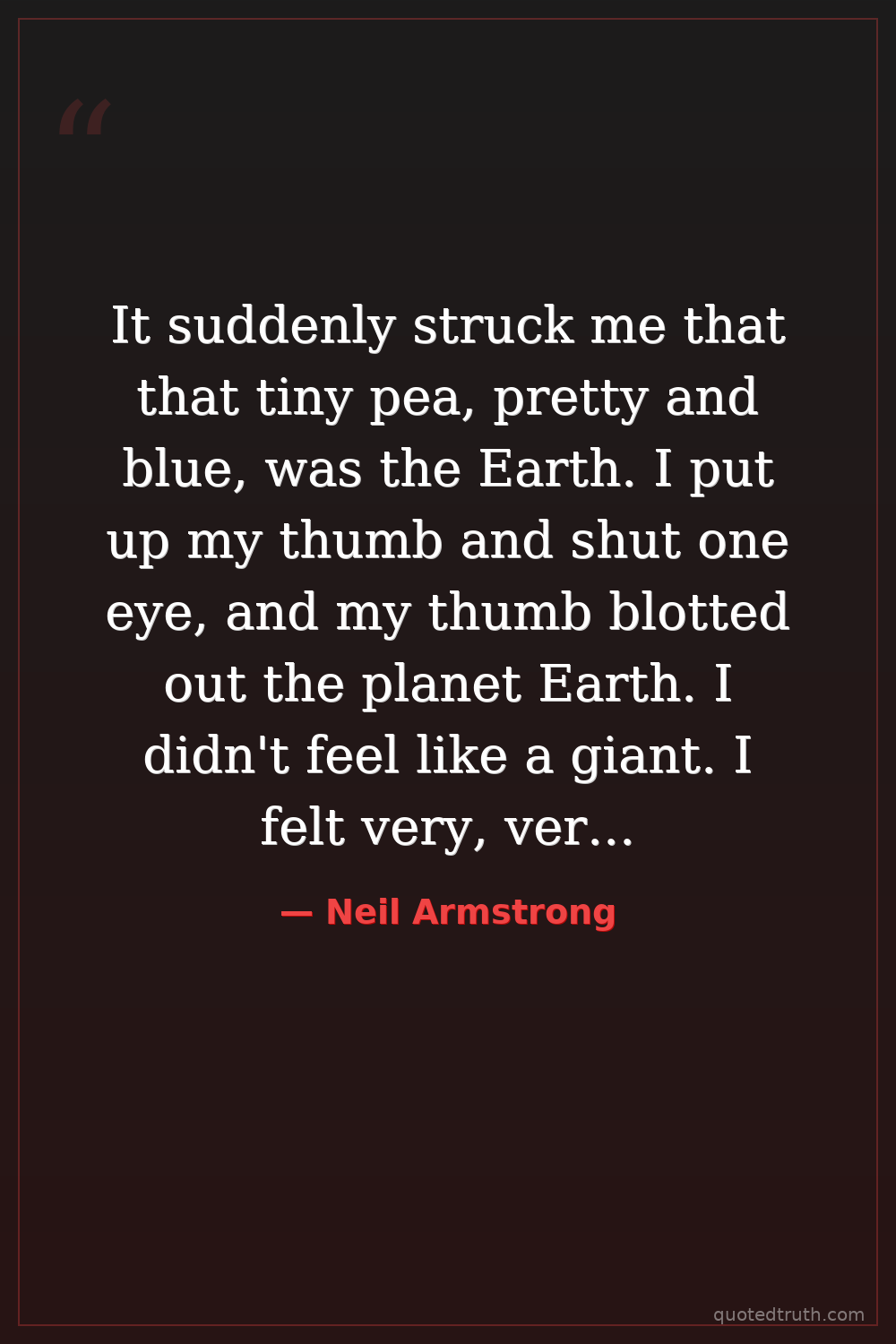 It suddenly struck me that that tiny pea, pretty and blue, was the Earth. I put up my thumb and shut one eye, and my thumb blotted out the planet Earth. I didn't feel like a giant. I felt very, very small.