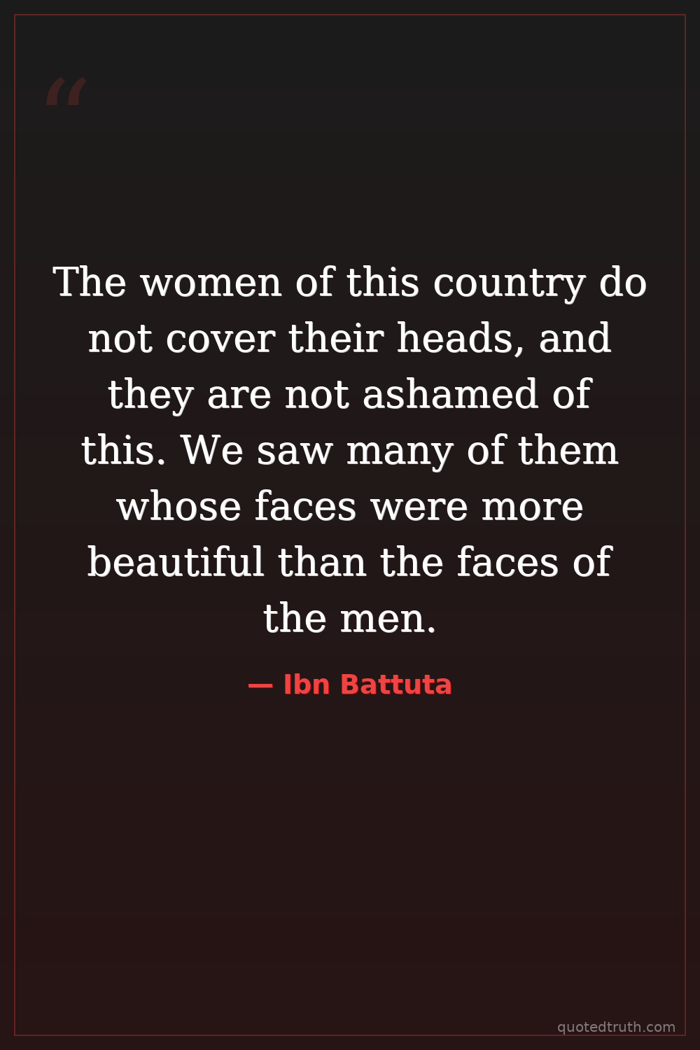 The women of this country do not cover their heads, and they are not ashamed of this. We saw many of them whose faces were more beautiful than the faces of the men.