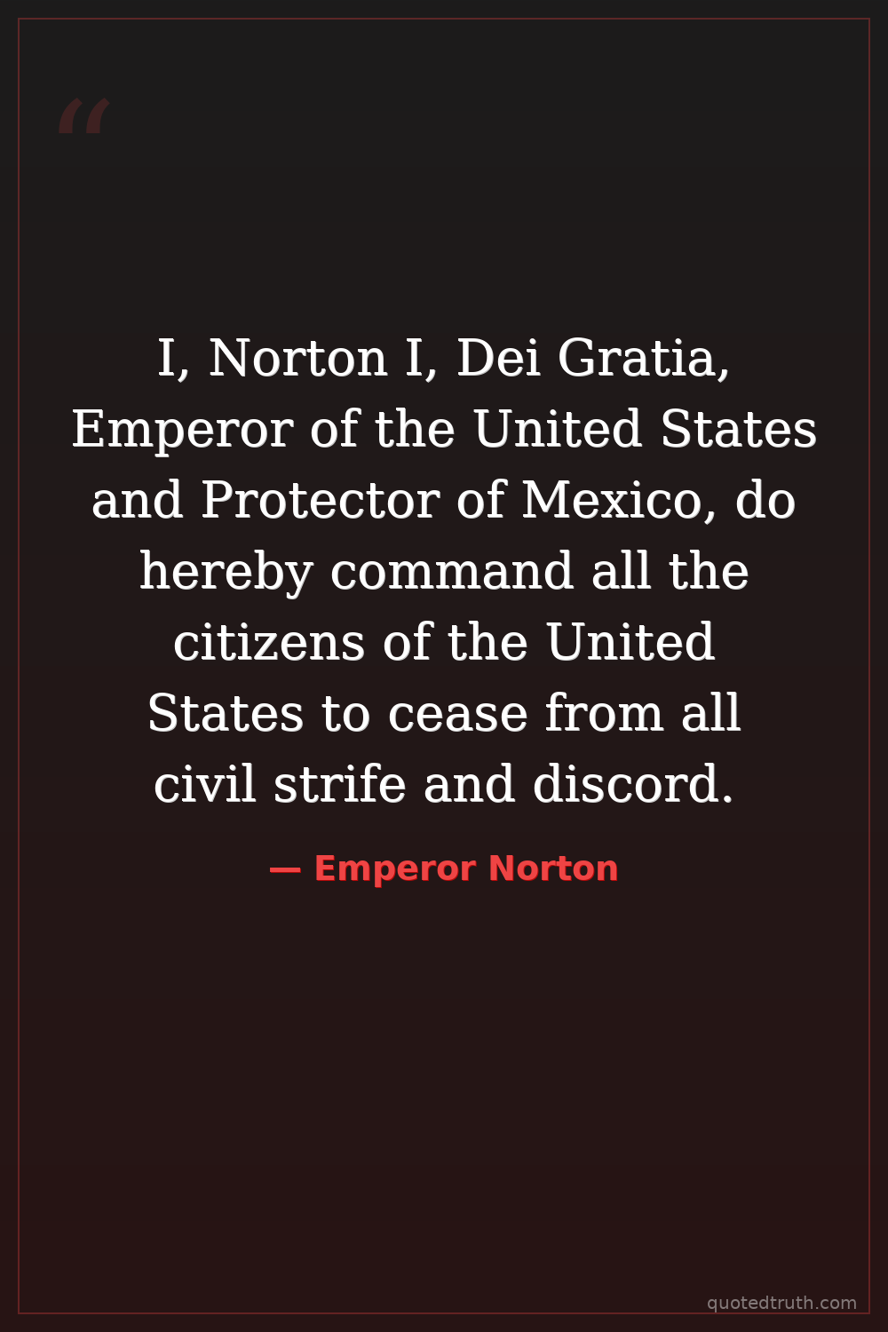 I, Norton I, Dei Gratia, Emperor of the United States and Protector of Mexico, do hereby command all the citizens of the United States to cease from all civil strife and discord.