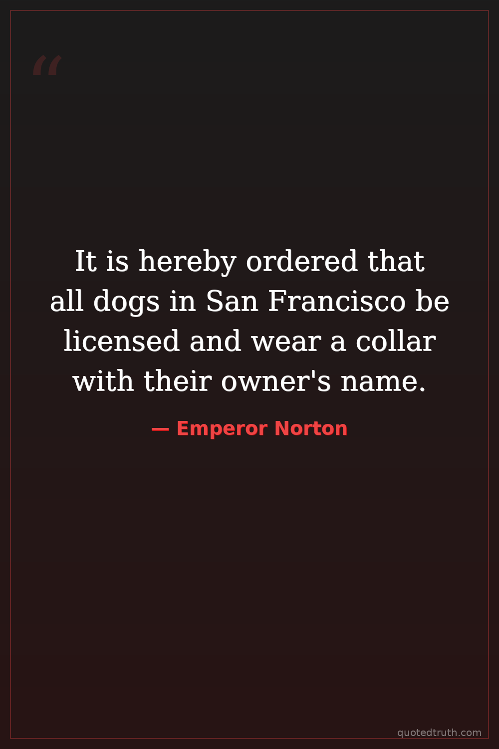 It is hereby ordered that all dogs in San Francisco be licensed and wear a collar with their owner's name.