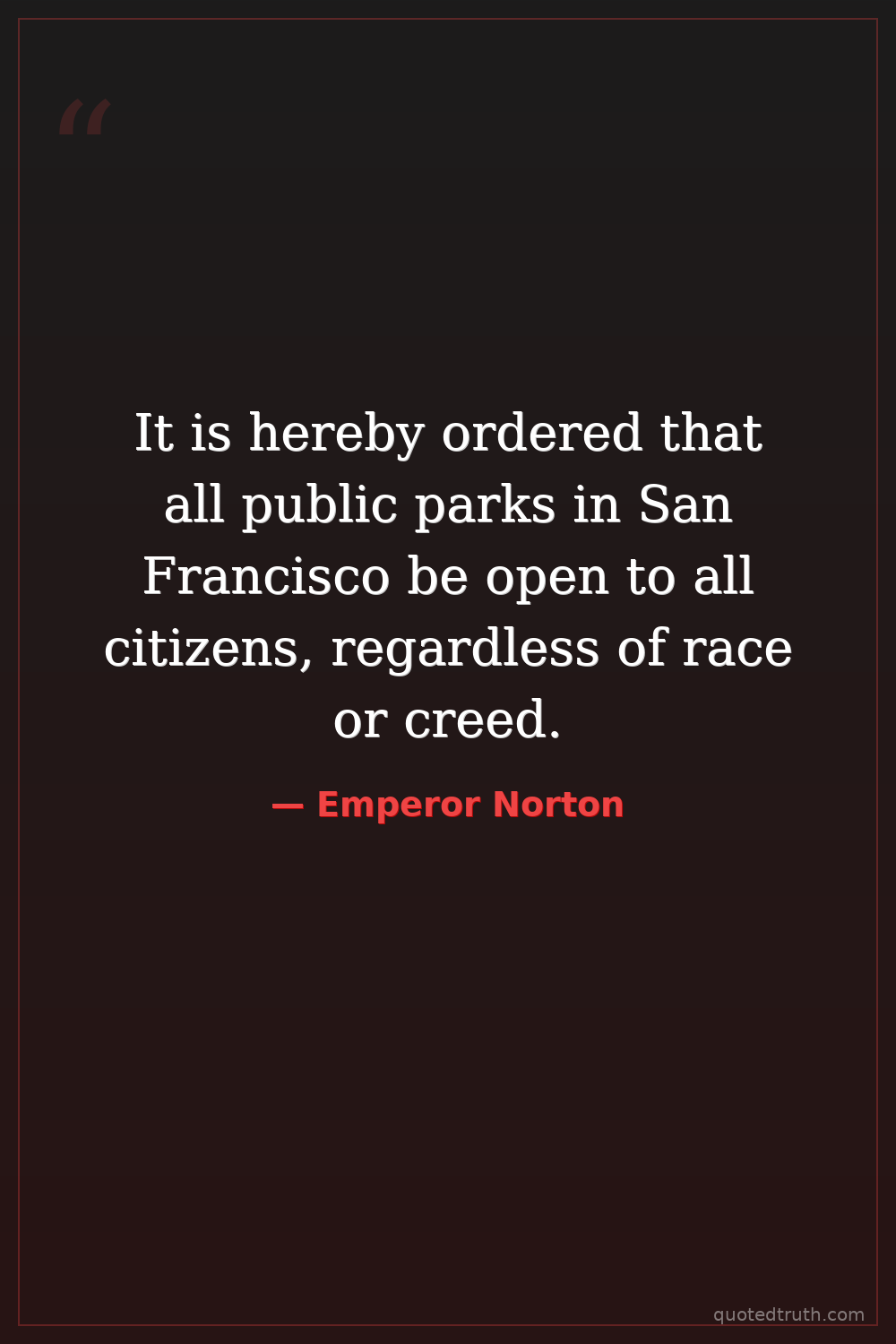 It is hereby ordered that all public parks in San Francisco be open to all citizens, regardless of race or creed.