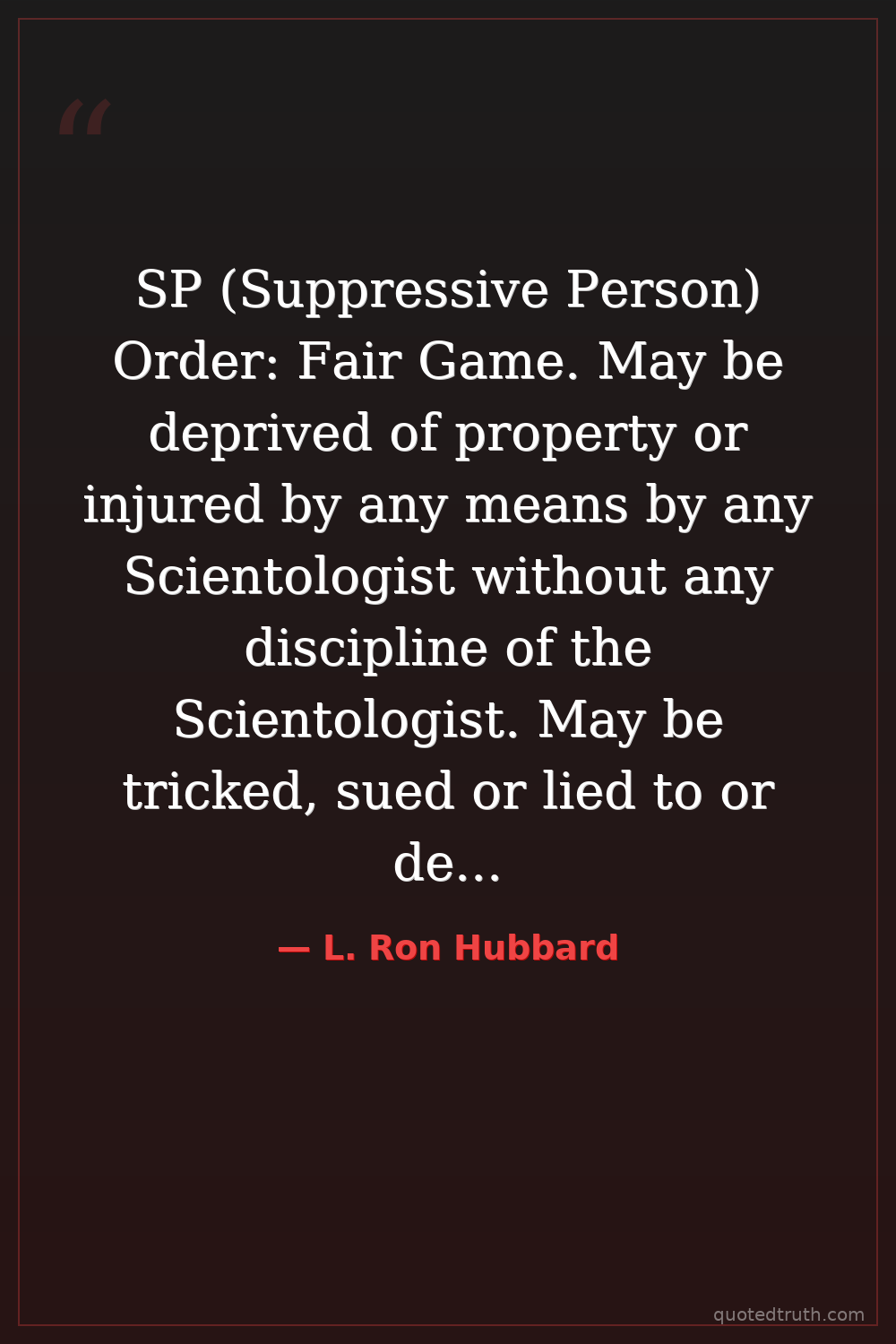 SP (Suppressive Person) Order: Fair Game. May be deprived of property or injured by any means by any Scientologist without any discipline of the Scientologist. May be tricked, sued or lied to or destroyed.