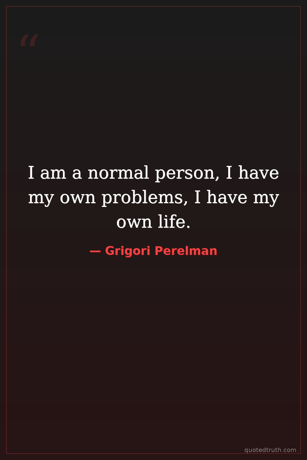 Controversial"I do not want money or fame. I do not want to be on display like an animal in a zoo. I am not a hero of mathematics. I am not even that successful. That is why I do not want to give any interviews."