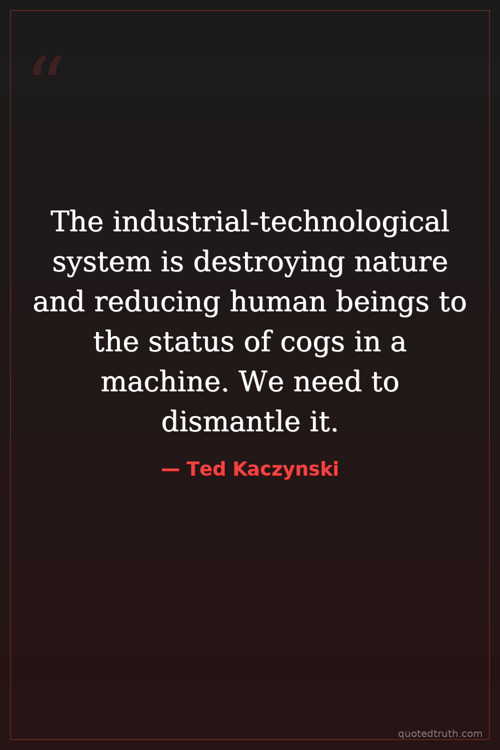 The industrial-technological system is destroying nature and reducing human beings to the status of cogs in a machine. We need to dismantle it.