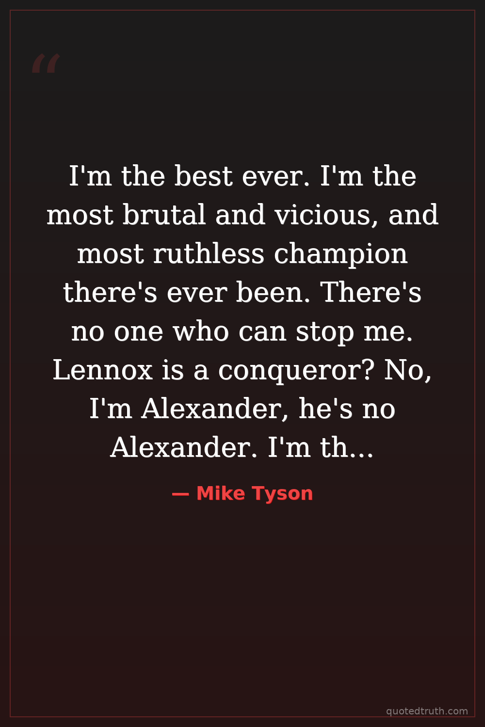 I'm the best ever. I'm the most brutal and vicious, and most ruthless champion there's ever been. There's no one who can stop me. Lennox is a conqueror? No, I'm Alexander, he's no Alexander. I'm the best ever. There's never been anybody as ruthless. I'm Sonny Liston, I'm Jack Dempsey. There's no one like me. I'm from their cloth. There's no one who can match me. My style is impetuous, my defense is impregnable, and I'm just ferocious. I want to eat his children. Praise be to Allah!