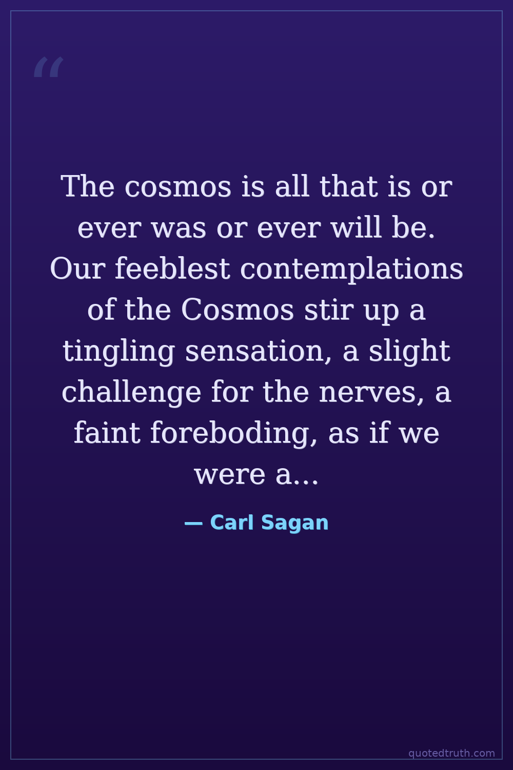 The cosmos is all that is or ever was or ever will be. Our feeblest contemplations of the Cosmos stir up a tingling sensation, a slight challenge for the nerves, a faint foreboding, as if we were approaching the greatest of mysteries.